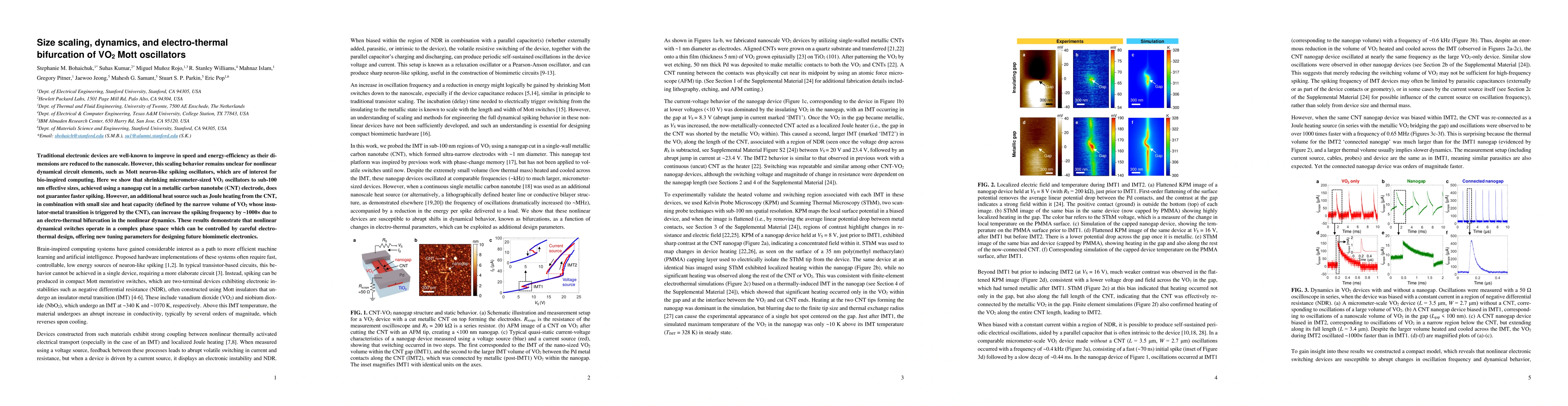 This paper investigates the scaling behavior of VO2 Mott oscillators, finding that reducing size to sub-100 nm does not inherently increase spiking speed. However, combining small size with Joule heating from a carbon nanotube can boost spiking frequency by ~1000x due to electro-thermal bifurcation, highlighting the importance of electro-thermal design in bio-inspired computing.