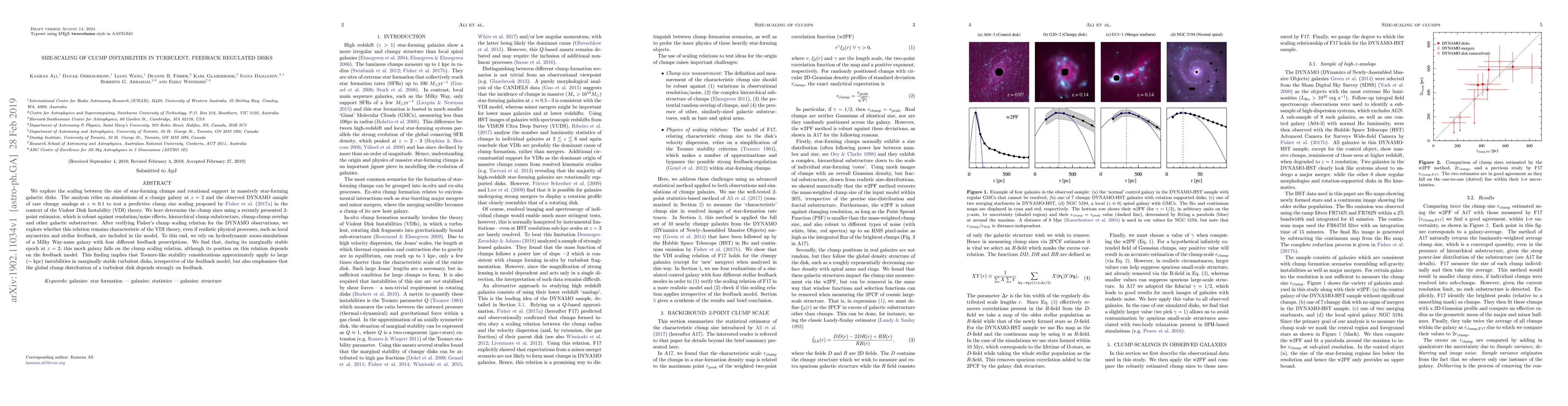 We explore the scaling between the size of star-forming clumps and rotational support in massively star-forming galactic disks. The analysis relies on simulations of a clumpy galaxy at $z=2$ and the observed DYNAMO sample of rare clumpy analogs at $z\approx0.1$ to test a predictive clump size scaling proposed by \citet{Fisher2017ApJ...839L...5F} in the context of the Violent Disk Instability (VDI) theory. We here determine the clump sizes using a recently presented 2-point estimator, which is robust against resolution/noise effects, hierarchical clump substructure, clump-clump overlap and other galactic substructure. After verifying Fisher's clump scaling relation for the DYNAMO observations, we explore whether this relation remains characteristic of the VDI theory, even if realistic physical processes, such as local asymetries and stellar feedback, are included in the model. To this end, we rely on hydrodynamic zoom-simulations of a Milky Way-mass galaxy with four different feedback prescriptions. We find that, during its marginally stable epoch at $z=2$, this mock galaxy falls on the clump scaling relation, although its position on this relation depends on the feedback model. This finding implies that Toomre-like stability considerations approximately apply to large ($\sim\rm kpc$) instabilities in marginally stable turbulent disks, irrespective of the feedback model, but also emphasizes that the global clump distribution of a turbulent disk depends strongly on feedback.