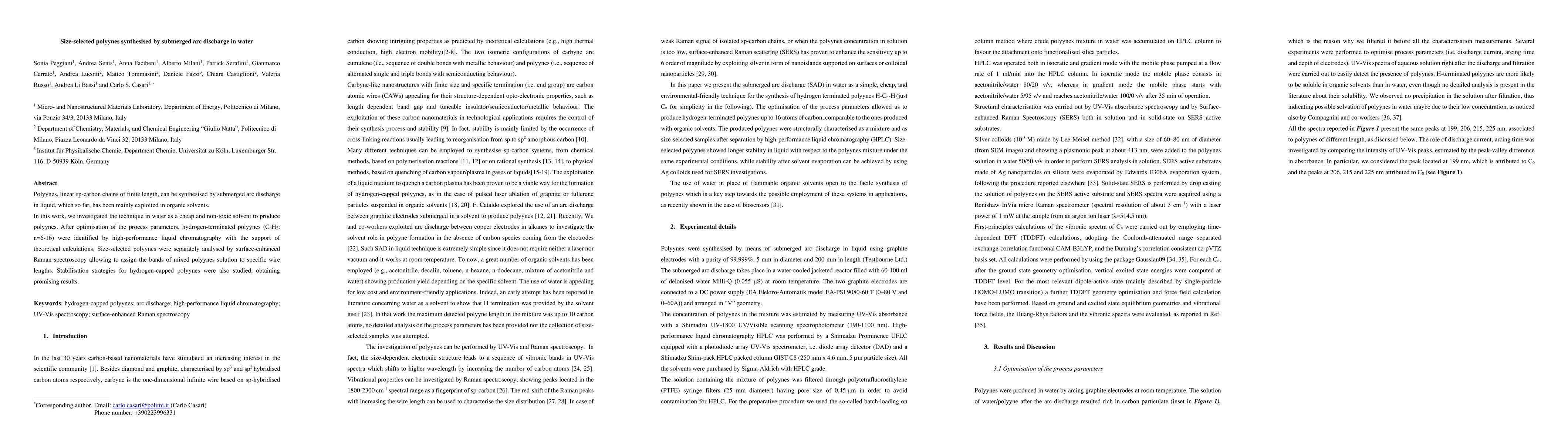 This paper investigates the submerged arc discharge (SAD) technique in water for synthesizing size-selected polyynes, examining the influence of current and voltage on yield and stability. Polyynes were identified and analyzed using HPLC, UV-Vis spectroscopy, and DFT, with size-selected samples further characterized by SERS.