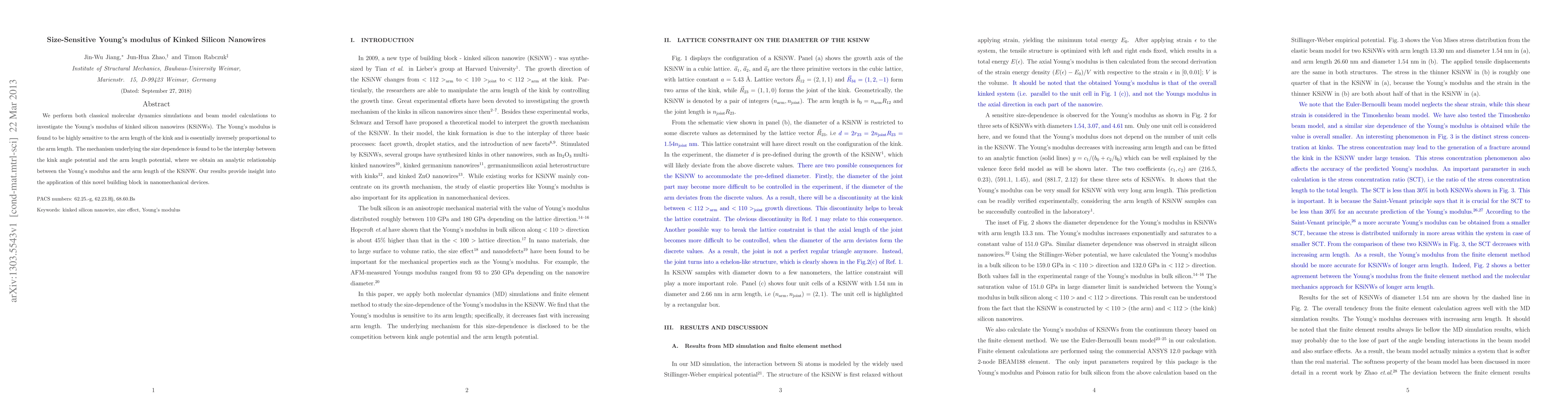 This study investigates the Young's modulus of kinked silicon nanowires using molecular dynamics and beam model calculations, revealing a strong inverse relationship with arm length. The size dependence is attributed to the interaction between kink angle and arm length potentials, offering valuable insights for nanomechanical applications.
