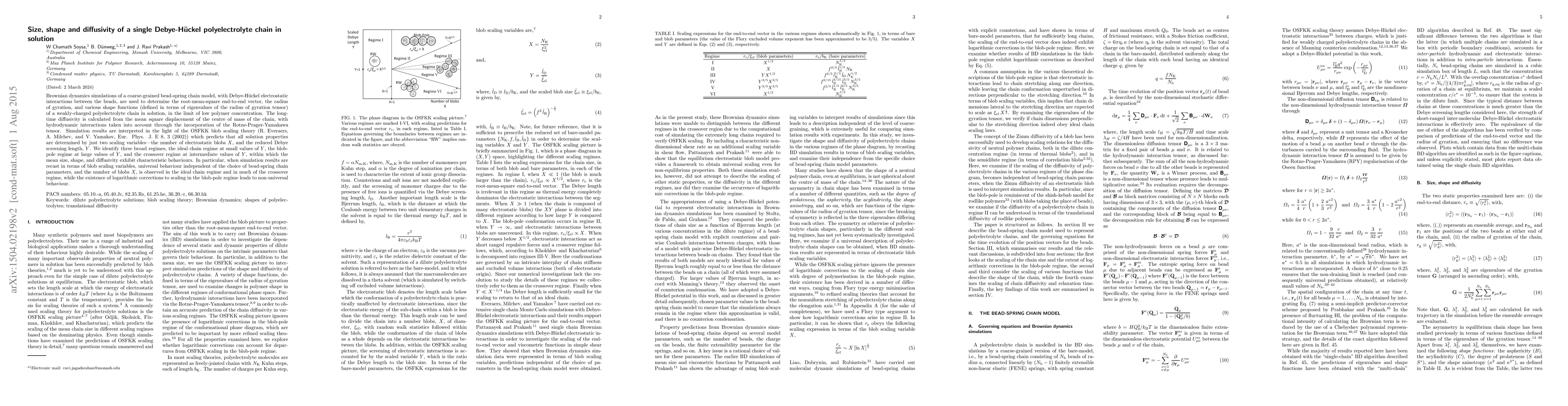 This paper uses Brownian dynamics simulations to study the size, shape, and diffusivity of a Debye-Hückel polyelectrolyte chain in solution, identifying three regimes based on the reduced Debye screening length. The results align with OSFKK blob scaling theory, revealing universal behaviors in the ideal chain and crossover regimes, while the blob-pole regime exhibits logarithmic corrections.