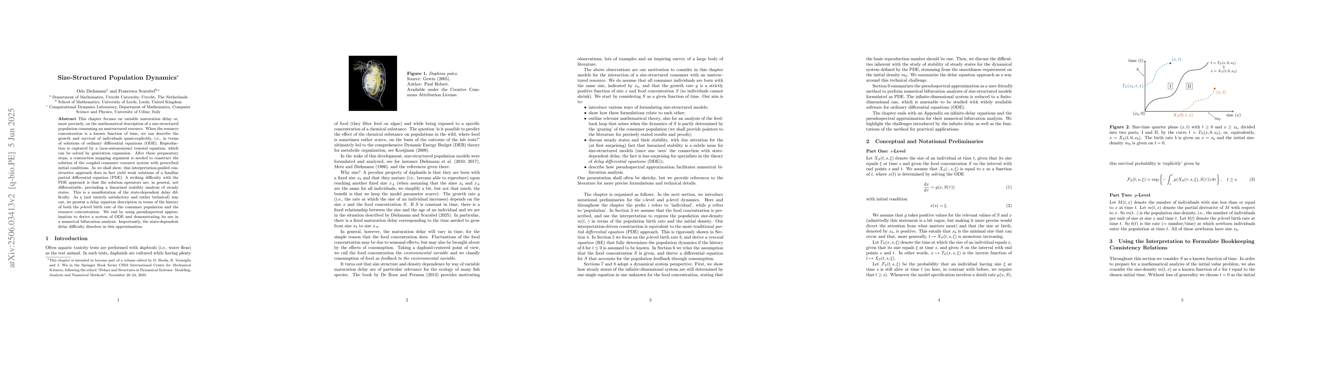 This chapter focuses on variable maturation delay or, more precisely, on the mathematical description of a size-structured population consuming an unstructured resource. When the resource concentration is a known function of time, we can describe the growth and survival of individuals quasi-explicitly, i.e., in terms of solutions of ordinary differential equations (ODE). Reproduction is captured by a (non-autonomous) renewal equation, which can be solved by generation expansion. After these preparatory steps, a contraction mapping argument is needed to construct the solution of the coupled consumer-resource system with prescribed initial conditions. As we shall show, this interpretation-guided constructive approach does in fact yield weak solutions of a familiar partial differential equation (PDE). A striking difficulty with the PDE approach is that the solution operators are, in general, not differentiable, precluding a linearized stability analysis of steady states. This is a manifestation of the state-dependent delay difficulty. As a (not entirely satisfactory and rather technical) way out, we present a delay equation description in terms of the history of both the $p$-level birth rate of the consumer population and the resource concentration. We end by using pseudospectral approximation to derive a system of ODE and demonstrating its use in a numerical bifurcation analysis. Importantly, the state-dependent delay difficulty dissolves in this approximation.