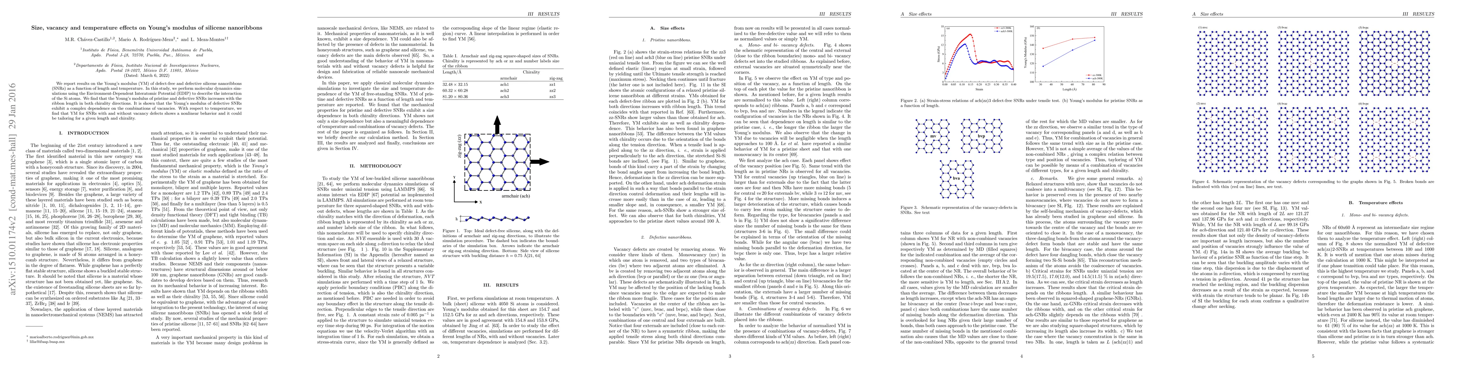 This study investigates the Young's modulus of silicene nanoribbons using molecular dynamics simulations, revealing that YM increases with ribbon length and is complexly affected by vacancies. Temperature influences YM nonlinearly, suggesting potential tailoring for specific applications.