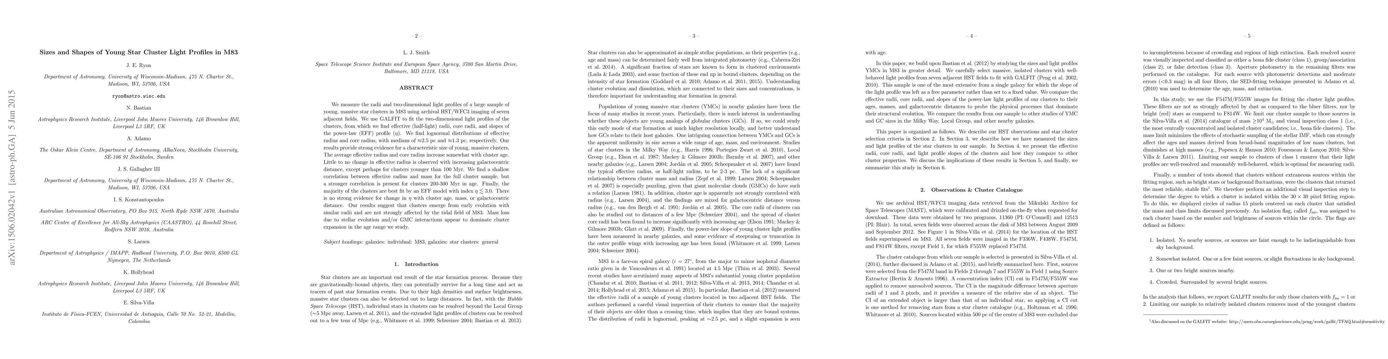 We measure the radii and two-dimensional light profiles of a large sample of young, massive star clusters in M83 using archival HST/WFC3 imaging of seven adjacent fields. We use GALFIT to fit the two-dimensional light profiles of the clusters, from which we find effective (half-light) radii, core radii, and slopes of the power-law (EFF) profile ($\eta$). We find lognormal distributions of effective radius and core radius, with medians of $\approx$2.5 pc and $\approx$1.3 pc, respectively. Our results provide strong evidence for a characteristic size of young, massive clusters. The average effective radius and core radius increase somewhat with cluster age. Little to no change in effective radius is observed with increasing galactocentric distance, except perhaps for clusters younger than 100 Myr. We find a shallow correlation between effective radius and mass for the full cluster sample, but a stronger correlation is present for clusters 200-300 Myr in age. Finally, the majority of the clusters are best fit by an EFF model with index $\eta\leq3.0$. There is no strong evidence for change in $\eta$ with cluster age, mass, or galactocentric distance. Our results suggest that clusters emerge from early evolution with similar radii and are not strongly affected by the tidal field of M83. Mass loss due to stellar evolution and/or GMC interactions appear to dominate cluster expansion in the age range we study.