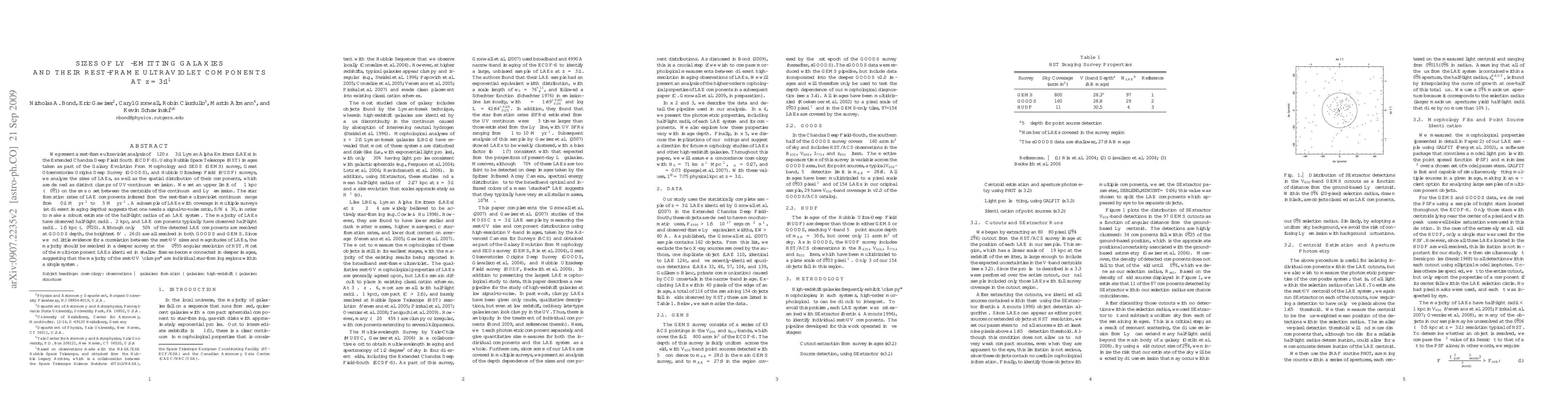 We present a rest-frame ultraviolet analysis of ~120 z~3.1 Lyman Alpha Emitters (LAEs) in the Extended Chandra Deep Field South (ECDF-S). Using Hubble Space Telescope (HST) images taken as part of the Galaxy Evolution From Morphology and SEDS (GEMS) survey, Great Observatories Origins Deep Survey (GOODS), and Hubble Ultradeep Field (HUDF) surveys, we analyze the sizes of LAEs, as well as the spatial distribution of their components, which are defined as distinct clumps of UV-continuum emission. We set an upper limit of ~1 kpc (~0.1") on the rms offset between the centroids of the continuum and Lyman-alpha emission. The star formation rates of LAE components inferred from the rest-frame ultraviolet continuum range from ~0.1 M_{sun}/yr to ~5$ M_{sun}/yr. A subsample of LAEs with coverage in multiple surveys (at different imaging depths) suggests that one needs a signal-to-noise ratio, S/N>~30, in order to make a robust estimate of the half-light radius of an LAE system. The majority of LAEs have observed half-light radii <~2 kpc, and LAE components typically have observed half-light radii <~1.5 kpc (<~ 0.2"). Although only ~50% of the detected LAE components are resolved at GOODS depth, the brightest (V<~26.3) are all resolved in both GOODS and GEMS. Since we find little evidence for a correlation between the rest-UV sizes and magnitudes of LAEs, the majority should be resolved in a deeper survey at the ~0.05" angular resolution of HST. Most of the multi-component LAEs identified in shallow frames become connected in deeper images, suggesting that the majority of the rest-UV "clumps" are individual star-forming regions within a single system.