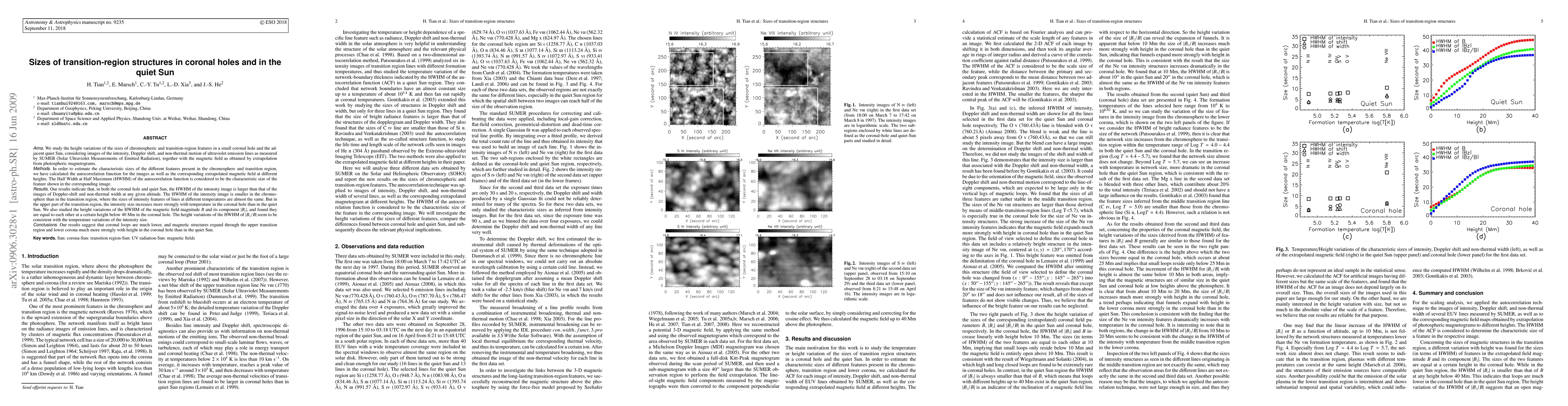 This study investigates the size variations of chromospheric and transition-region structures in a coronal hole and adjacent quiet Sun using SUMER data. Results show that intensity feature sizes are larger and increase more strongly with height in the transition region in coronal holes than in the quiet Sun, suggesting greater expansion of magnetic structures in coronal holes.