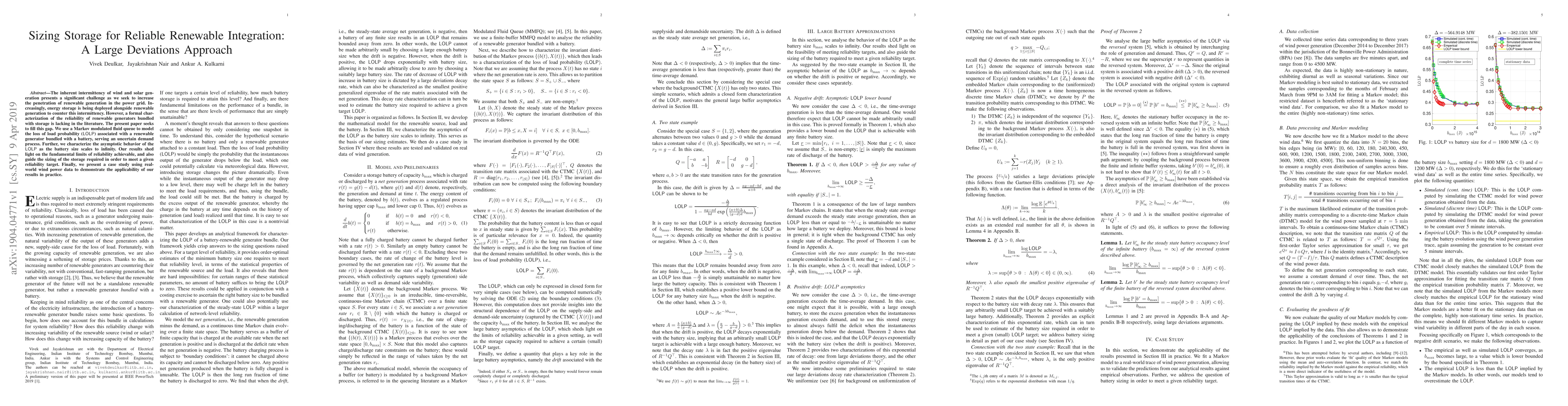 The inherent intermittency of wind and solar generation presents a significant challenge as we seek to increase the penetration of renewable generation in the power grid. Increasingly, energy storage is being deployed alongside renewable generation to counter this intermittency. However, a formal characterization of the reliability of renewable generators bundled with storage is lacking in the literature. The present paper seeks to fill this gap. We use a Markov modulated fluid queue to model the loss of load probability (LOLP) associated with a renewable generator bundled with a battery, serving an uncertain demand process. Further, we characterize the asymptotic behavior of the LOLP as the battery size scales to infinity. Our results shed light on the fundamental limits of reliability achievable, and also guide the sizing of the storage required in order to meet a given reliability target. Finally, we present a case study using real-world wind power data to demonstrate the applicability of our results in practice.