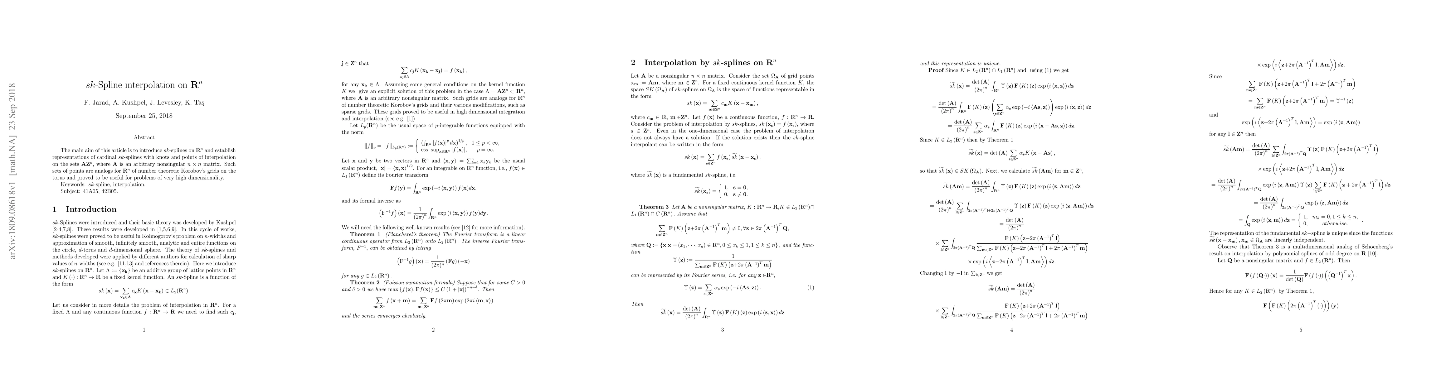 The main aim of this article is to introduce sk-splines on R^n and establish representations of cardinal sk-splines with knots and points of interpolation on the sets AZ^n, where A is an arbitrary nonsingular matrix. Such sets of points are analogs for R^n of number theoretic Korobov's grids on the torus and proved to be useful for problems of very high dimensionality.