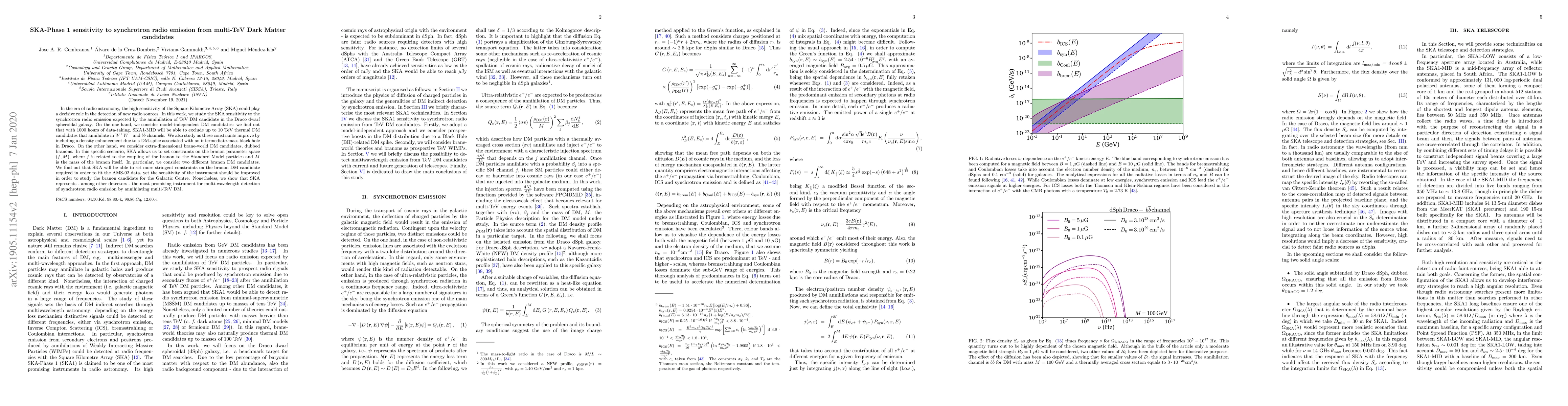 This paper explores the Square Kilometre Array's (SKA) sensitivity to synchrotron radio emission from TeV dark matter (DM) candidates, focusing on the Draco dwarf galaxy. SKA1-MID can exclude up to 10 TeV thermal DM candidates, and constraints improve with DM-spike density enhancements. SKA also sets stringent limits on extra-dimensional brane-world DM candidates called branons, though further improvements are needed for Galactic Centre studies.