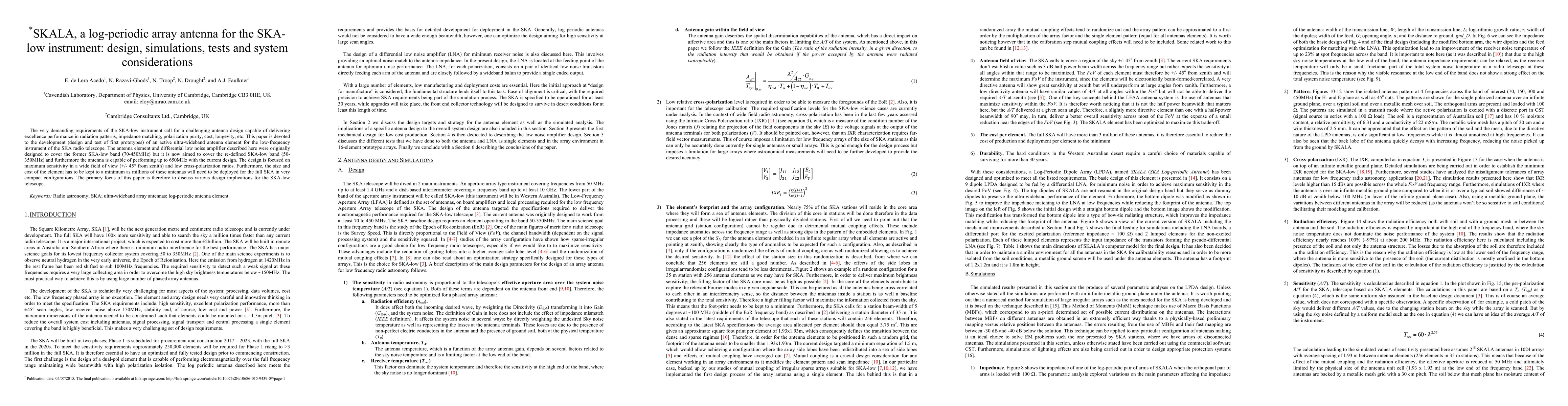 This paper details the design, simulations, and testing of the SKALA log-periodic array antenna for the SKA-low instrument, focusing on achieving optimal performance across a wide frequency range while minimizing cost and size for mass deployment. The antenna aims for maximum sensitivity and low cross-polarization ratios within a broad field of view.