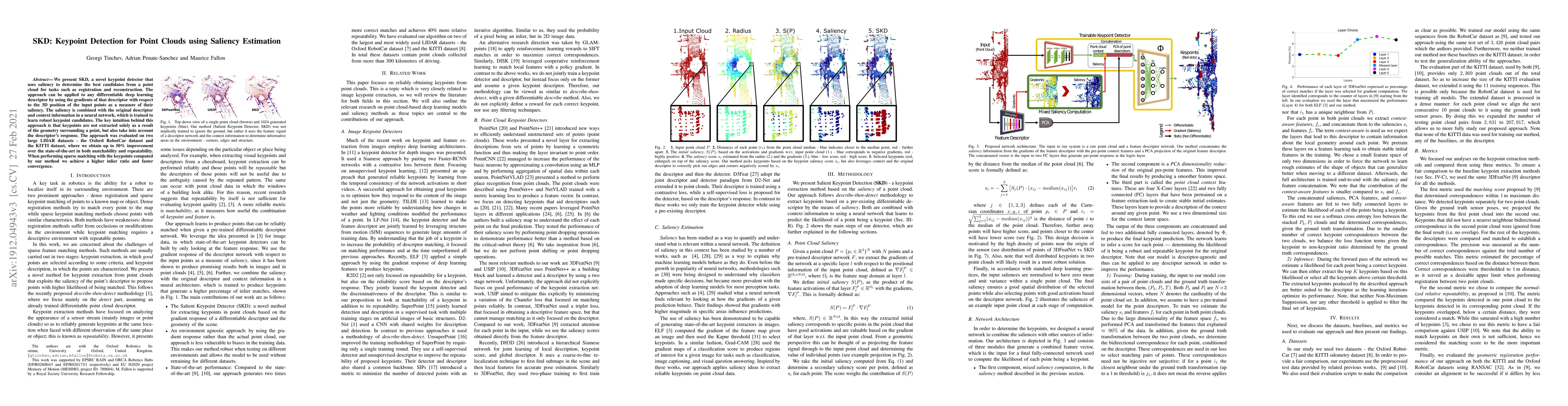 We present SKD, a novel keypoint detector that uses saliency to determine the best candidates from a point cloud for tasks such as registration and reconstruction. The approach can be applied to any differentiable deep learning descriptor by using the gradients of that descriptor with respect to the 3D position of the input points as a measure of their saliency. The saliency is combined with the original descriptor and context information in a neural network, which is trained to learn robust keypoint candidates. The key intuition behind this approach is that keypoints are not extracted solely as a result of the geometry surrounding a point, but also take into account the descriptor's response. The approach was evaluated on two large LIDAR datasets - the Oxford RobotCar dataset and the KITTI dataset, where we obtain up to 50% improvement over the state-of-the-art in both matchability and repeatability. When performing sparse matching with the keypoints computed by our method we achieve a higher inlier ratio and faster convergence.