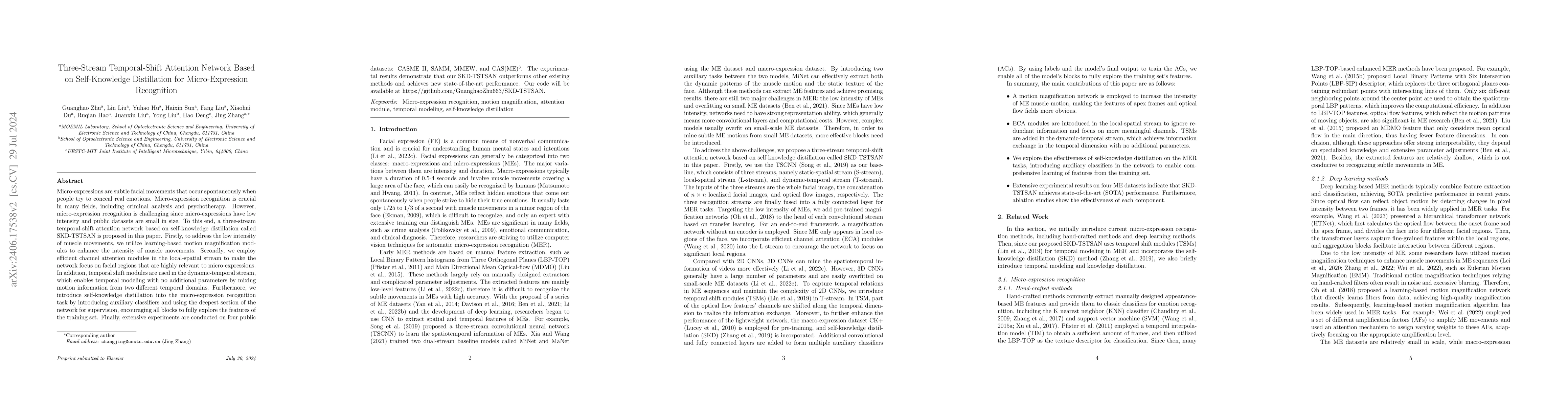 This paper proposes SKD-TSTSAN, a three-stream temporal-shift attention network with self-knowledge distillation for micro-expression recognition, enhancing micro-expression intensity and focusing on relevant facial regions to improve detection. Experiments on four datasets show superior performance over existing methods.