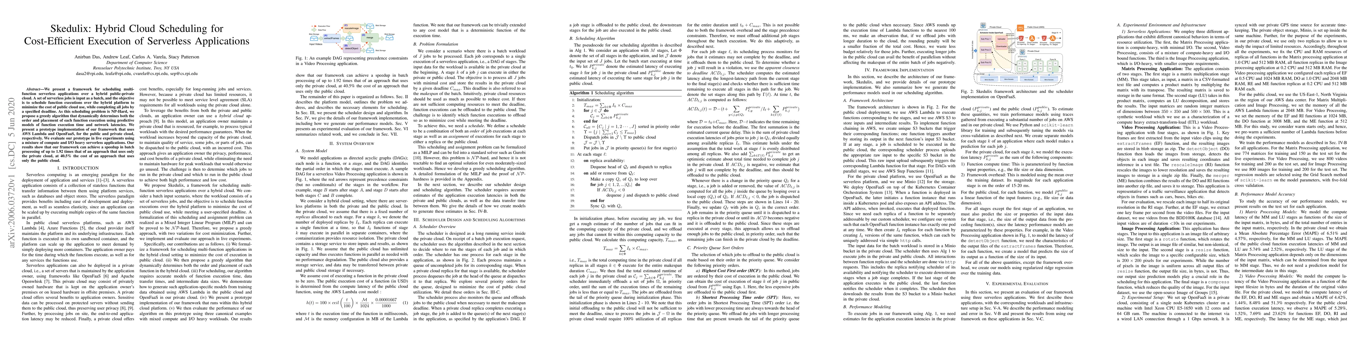 Skedulix is a hybrid cloud scheduling framework designed to optimize cost-efficient execution of serverless applications by balancing workloads between public and private clouds. The proposed greedy algorithm dynamically schedules function executions to minimize public cloud usage while meeting deadlines, achieving up to 1.92 times the speedup in batch processing compared to private cloud-only approaches, at 40.5% of the cost.