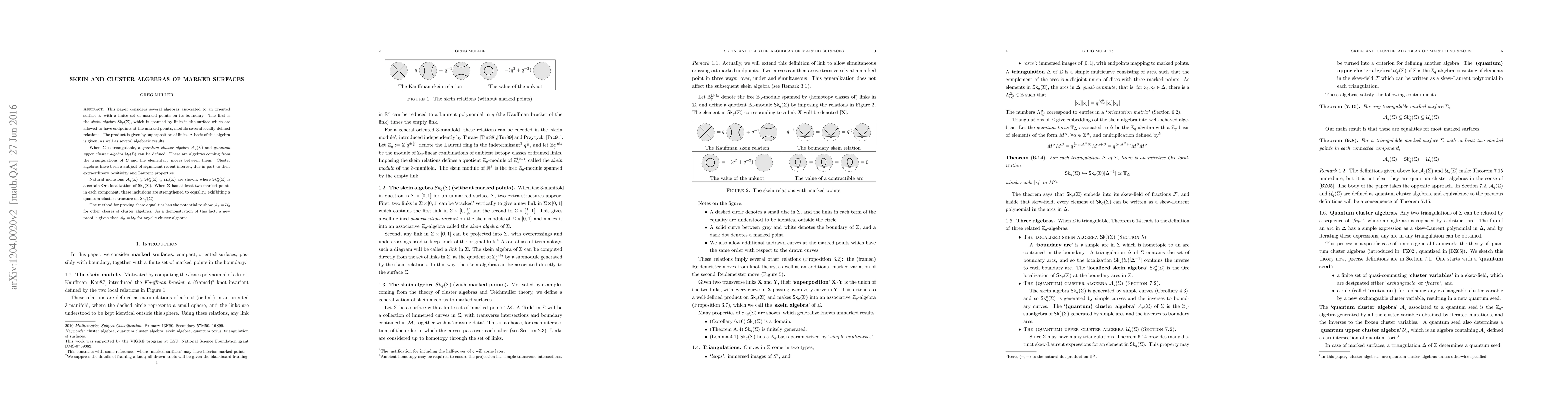 This paper defines several algebras associated to an oriented surface $S$ with a finite set of marked points on the boundary. The first is the skein algebra $Sk_q(S)$, which is spanned by links in the surface which are allowed to have endpoints at the marked points, modulo several locally defined relations. The product is given by superposition of links. A basis of this algebra is given, as well as several algebraic results. When $S$ is triangulable, the quantum cluster algebra $A_q(S)$ and quantum upper cluster algebra U_q(S) can be defined. These are algebras coming from the triangulations of S and the elementary moves between them. Natural inclusions $A_q(S)$ into $Sk_q^o(S)$ into $U_q(S)$ are shown, where $Sk_q^o(S)$ is a certain Ore localization of $Sk_q(S)$. When $S$ has at least two marked points in each component, these inclusions are strengthened to equality, exhibiting a quantum cluster structure on $Sk_q^o(S)$. The method for proving these equalities has potential to show $A_q=U_q$ for other classes of cluster algebras. As a demonstration of this fact, a new proof is given that $A_q=U_q$ for acyclic cluster algebras