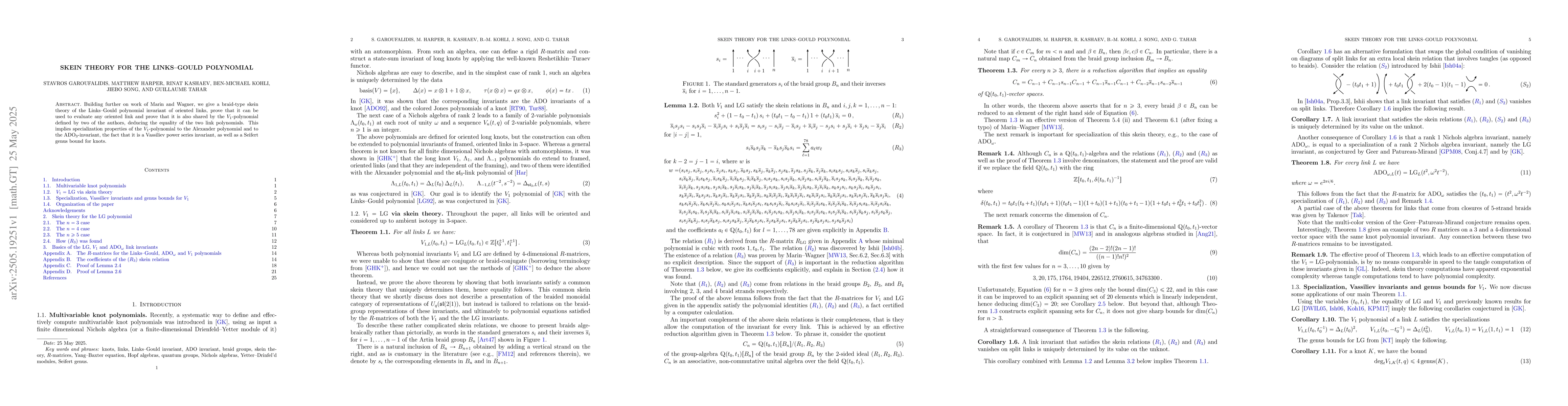 The paper presents a comprehensive skein theory for the Links-Gould polynomial, linking it to the $V_1$-polynomial and proving its properties as a Vassiliev invariant with genus bounds.