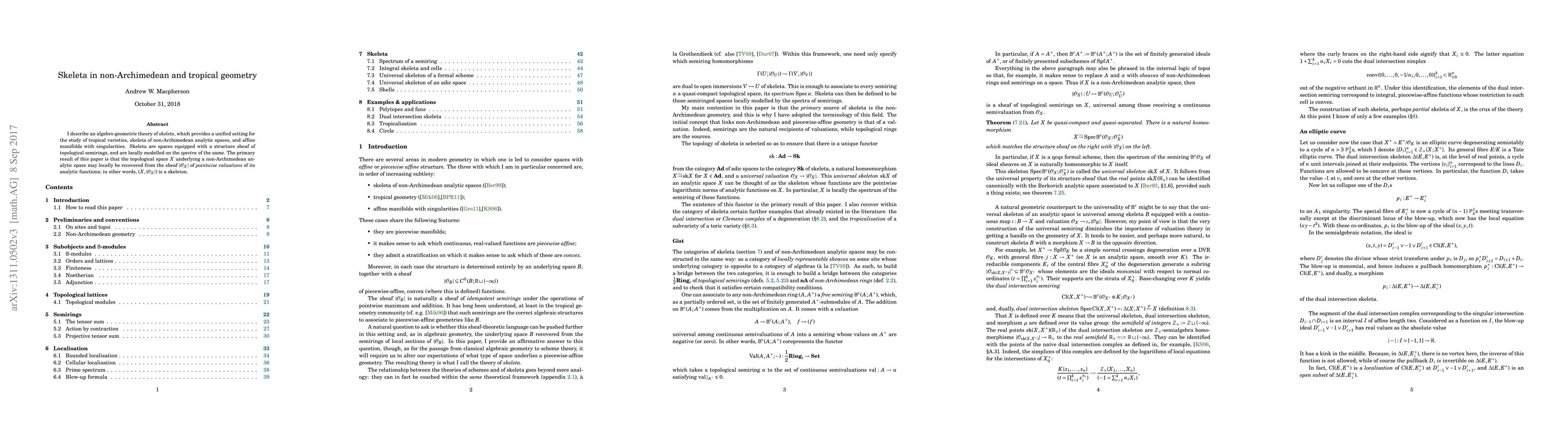 The paper introduces an algebro-geometric theory of skeleta unifying the study of tropical varieties, non-Archimedean analytic spaces, and singular affine manifolds. The key result shows that a non-Archimedean analytic space's underlying topological space can be locally reconstructed from its sheaf of pointwise valuations.