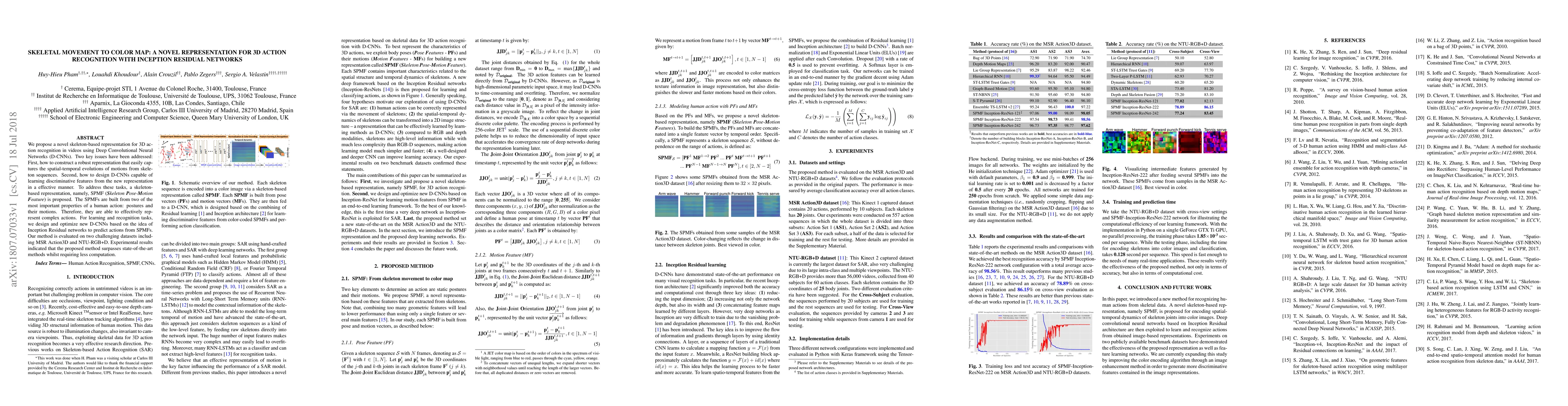 This paper proposes a novel skeleton-based representation, SPMF, for 3D action recognition using D-CNNs, specifically optimized Inception Residual Networks. The method effectively captures spatial-temporal evolutions from skeleton sequences and outperforms state-of-the-art on MSR Action3D and NTU-RGB+D datasets with lower computational requirements.