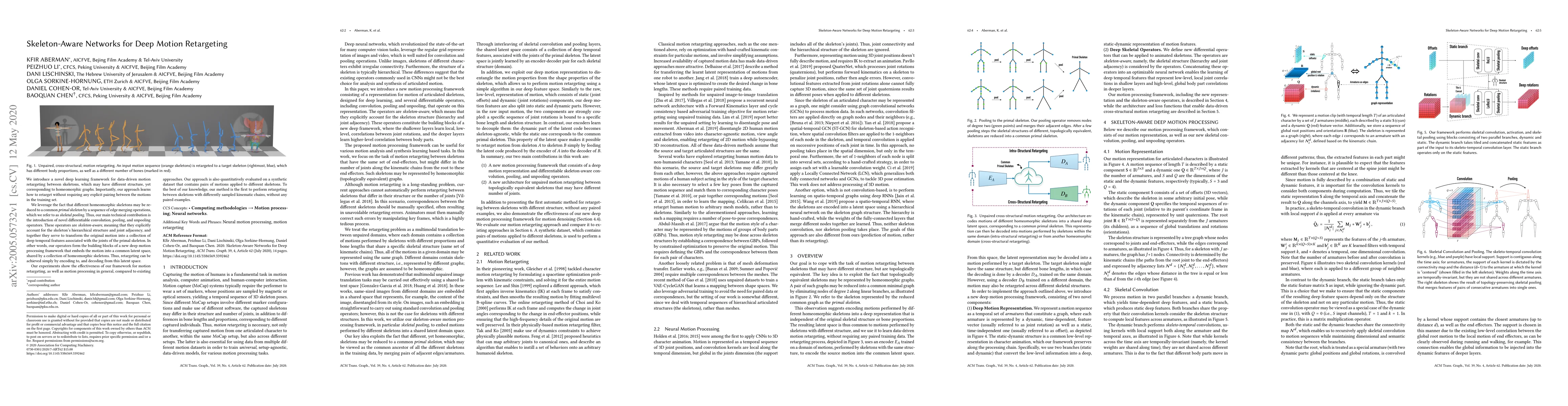 This paper proposes a novel deep learning framework for motion retargeting between skeletons with different structures by introducing skeleton-aware differentiable convolution, pooling, and unpooling operators. The framework learns to retarget motions without explicit pairings, leveraging a common latent space for homeomorphic skeletons.