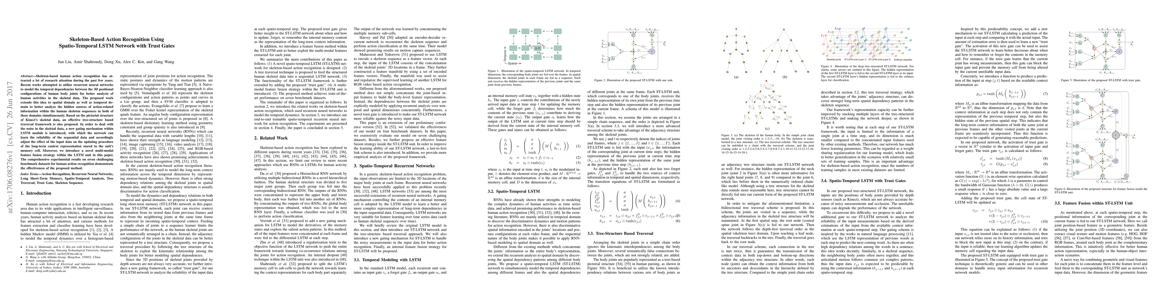 This paper proposes a skeleton-based action recognition method using a spatio-temporal LSTM network with trust gates to model temporal dependencies in human skeleton sequences. The method incorporates a tree-structure traversal framework and a novel gating mechanism to handle noise and improve feature fusion, achieving superior performance on benchmark datasets.