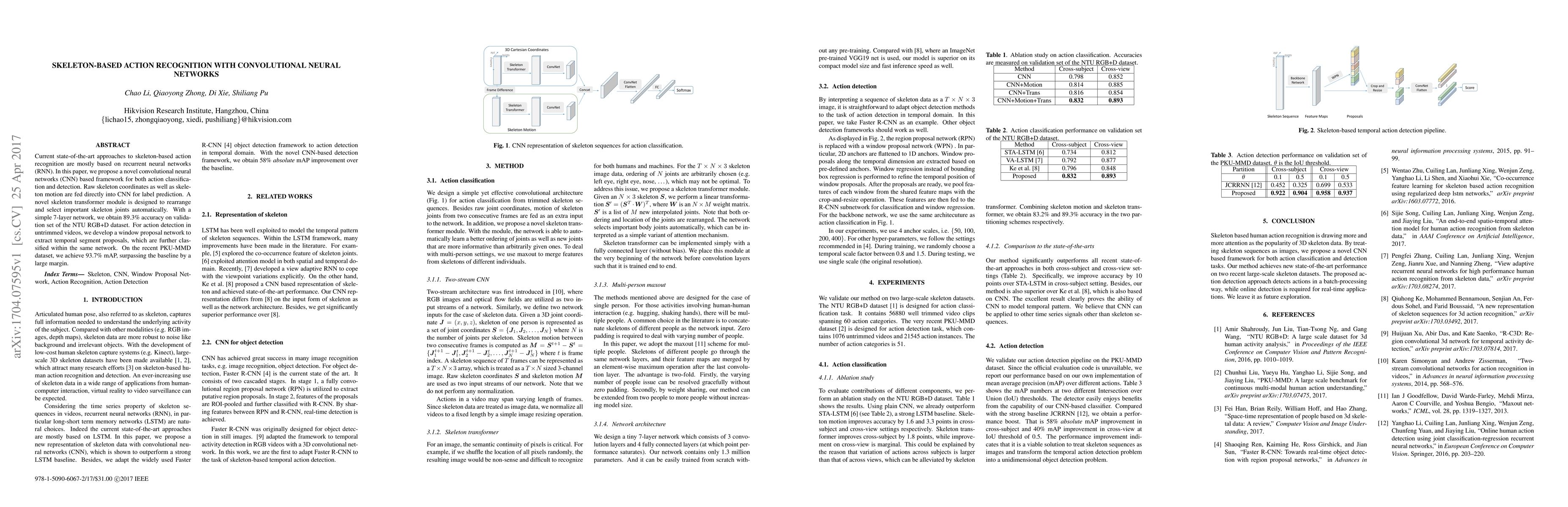 This paper introduces a CNN-based framework for skeleton-based action recognition and detection, featuring a novel skeleton transformer module and a window proposal network. The proposed method achieves high accuracy (89.3%) on the NTU RGB+D dataset and 93.7% mAP on the PKU-MMD dataset, outperforming RNN-based baselines.