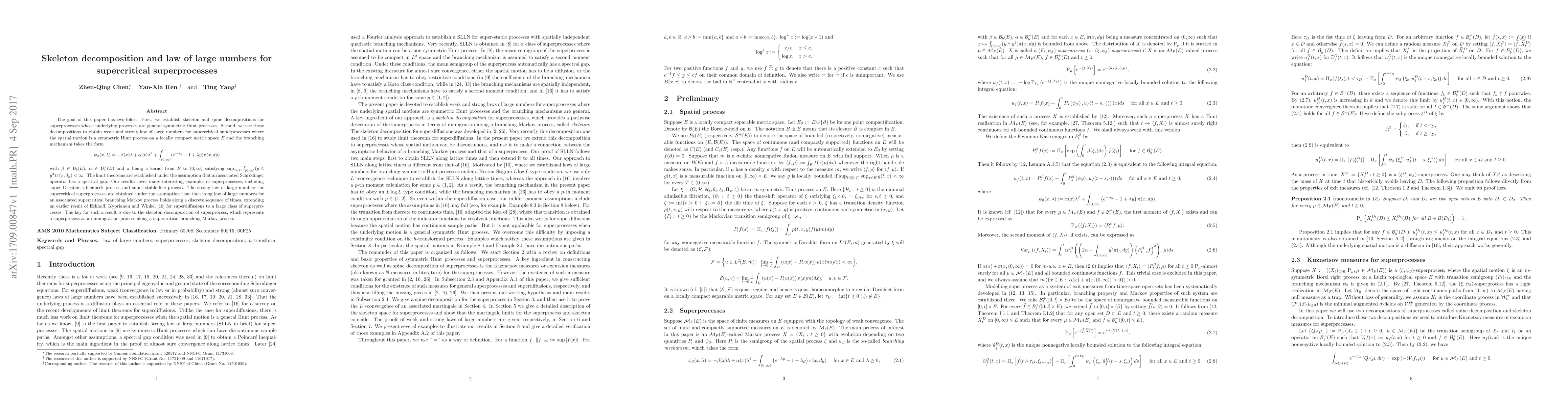This paper establishes skeleton and spine decompositions for superprocesses driven by general symmetric Hunt processes, and uses these decompositions to derive a weak and strong law of large numbers for supercritical superprocesses under certain conditions, including the existence of a spectral gap in an associated Schrödinger operator. The results extend previous findings to a broader class of superprocesses.