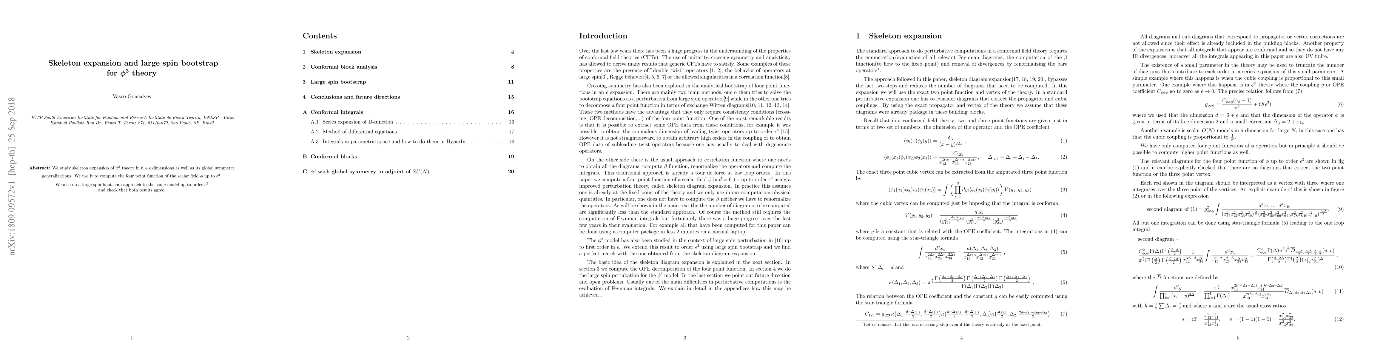 We study skeleton expansion of $\phi^3$ theory in $6+\epsilon$ dimensions as well as its global symmetry generalizations. We use it to compute the four point function of the scalar field $\phi$ up to $\epsilon^2$. We also do a large spin bootstrap approach to the same model up to order $\epsilon^2$ and check that both results agree.