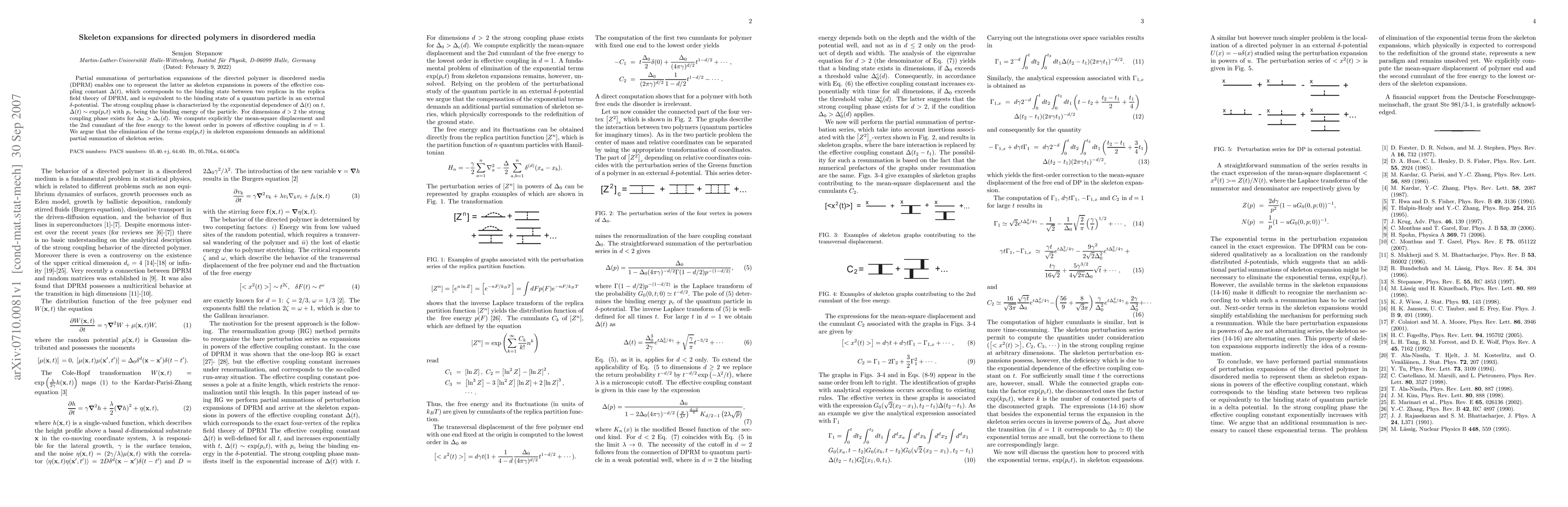 This paper explores the skeleton expansions for directed polymers in disordered media, representing them in terms of effective coupling constants. It computes mean-square displacement and the second cumulant of the free energy in dimension $d=1$, and discusses the necessity for additional summations to eliminate exponential terms in the strong coupling phase.