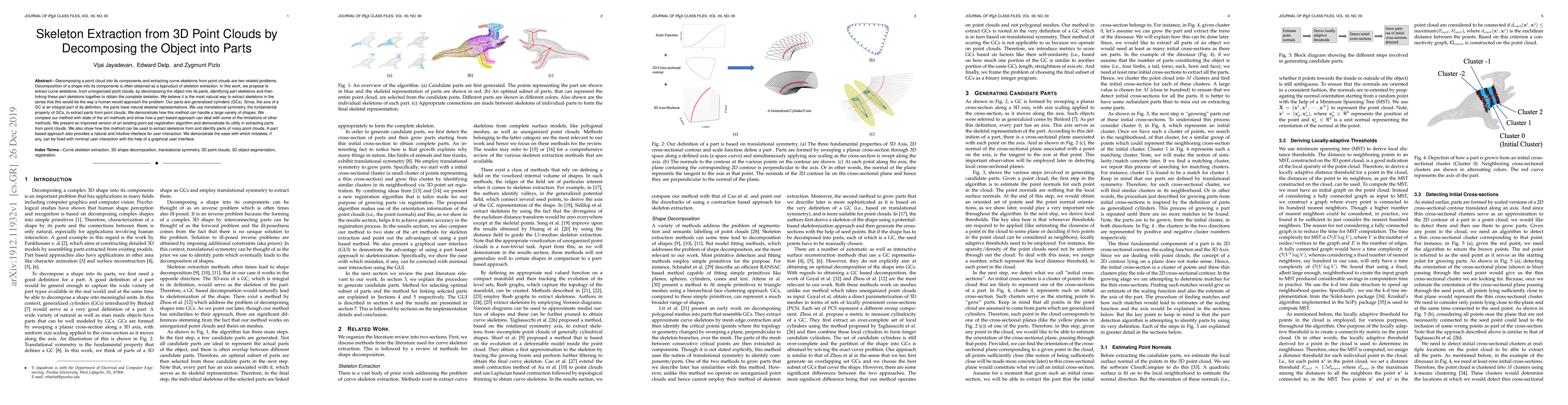 This paper proposes a method for extracting curve skeletons from unorganized 3D point clouds by decomposing the object into generalized cylindrical parts, identifying part skeletons, and linking them. The method leverages translational symmetry and an improved point set registration algorithm to handle a variety of shapes, including noisy data, and offers an intuitive interface for user corrections.