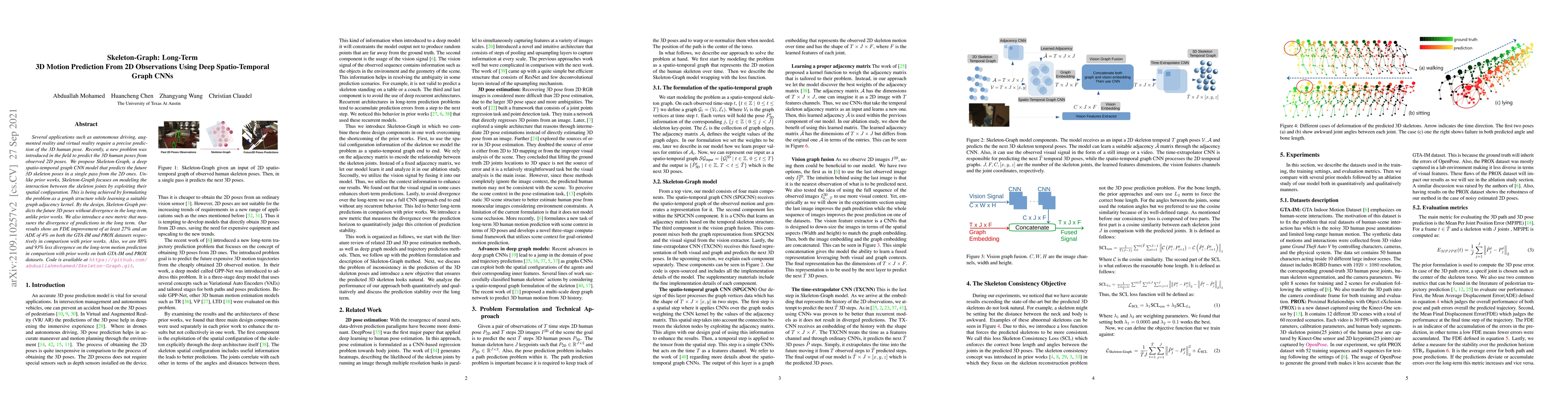The paper proposes Skeleton-Graph, a deep spatio-temporal graph CNN model for long-term 3D human pose prediction from 2D observations, achieving better accuracy and lower divergence compared to prior works. The model effectively captures joint interactions through a graph structure, resulting in significant improvements on GTA-IM and PROX datasets.
