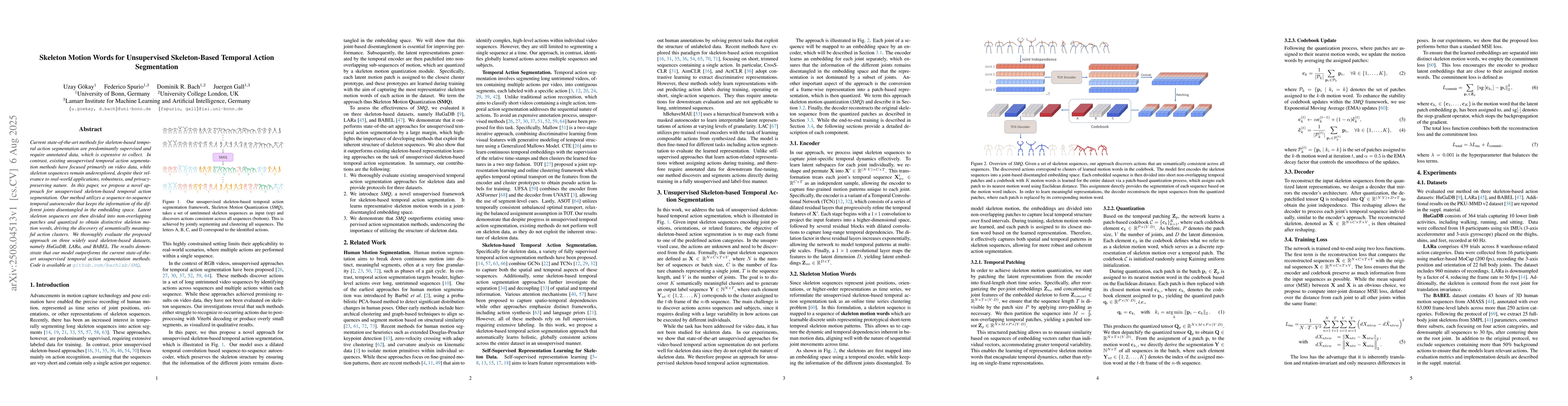 Current state-of-the-art methods for skeleton-based temporal action segmentation are predominantly supervised and require annotated data, which is expensive to collect. In contrast, existing unsupervised temporal action segmentation methods have focused primarily on video data, while skeleton sequences remain underexplored, despite their relevance to real-world applications, robustness, and privacy-preserving nature. In this paper, we propose a novel approach for unsupervised skeleton-based temporal action segmentation. Our method utilizes a sequence-to-sequence temporal autoencoder that keeps the information of the different joints disentangled in the embedding space. Latent skeleton sequences are then divided into non-overlapping patches and quantized to obtain distinctive skeleton motion words, driving the discovery of semantically meaningful action clusters. We thoroughly evaluate the proposed approach on three widely used skeleton-based datasets, namely HuGaDB, LARa, and BABEL. The results demonstrate that our model outperforms the current state-of-the-art unsupervised temporal action segmentation methods. Code is available at https://github.com/bachlab/SMQ .