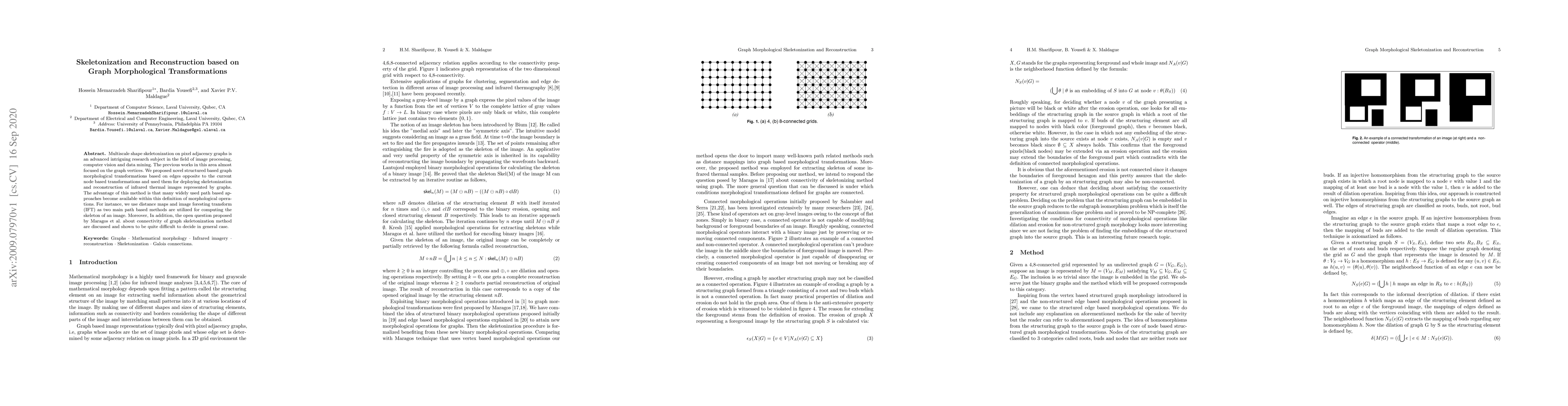 Multiscale shape skeletonization on pixel adjacency graphs is an advanced intriguing research subject in the field of image processing, computer vision and data mining. The previous works in this area almost focused on the graph vertices. We proposed novel structured based graph morphological transformations based on edges opposite to the current node based transformations and used them for deploying skeletonization and reconstruction of infrared thermal images represented by graphs. The advantage of this method is that many widely used path based approaches become available within this definition of morphological operations. For instance, we use distance maps and image foresting transform (IFT) as two main path based methods are utilized for computing the skeleton of an image. Moreover, In addition, the open question proposed by Maragos et al (2013) about connectivity of graph skeletonization method are discussed and shown to be quite difficult to decide in general case.