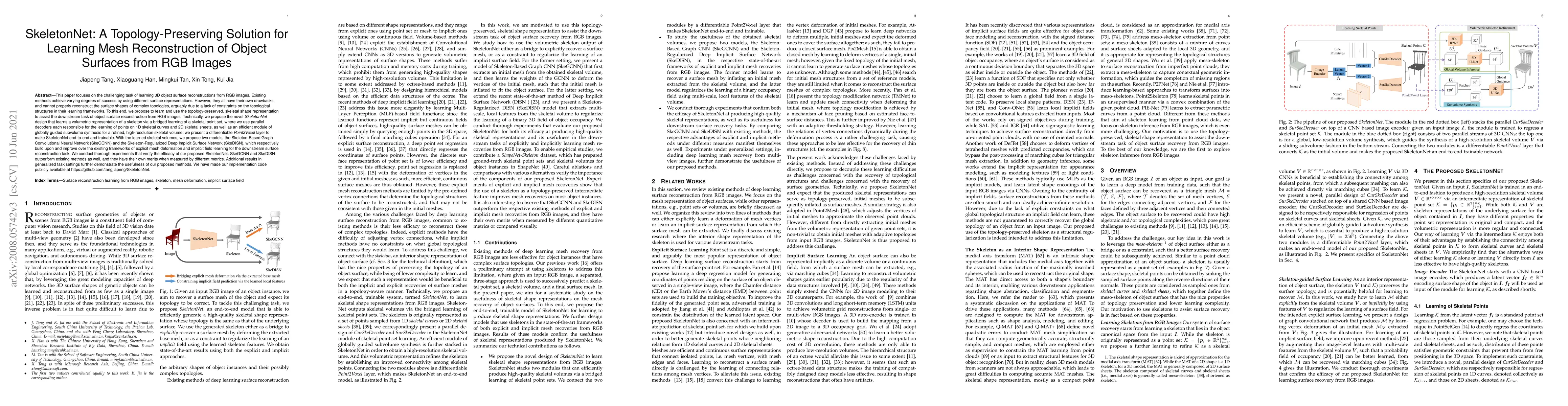 This paper focuses on the challenging task of learning 3D object surface reconstructions from RGB images. Existingmethods achieve varying degrees of success by using different surface representations. However, they all have their own drawbacks,and cannot properly reconstruct the surface shapes of complex topologies, arguably due to a lack of constraints on the topologicalstructures in their learning frameworks. To this end, we propose to learn and use the topology-preserved, skeletal shape representationto assist the downstream task of object surface reconstruction from RGB images. Technically, we propose the novelSkeletonNetdesign that learns a volumetric representation of a skeleton via a bridged learning of a skeletal point set, where we use paralleldecoders each responsible for the learning of points on 1D skeletal curves and 2D skeletal sheets, as well as an efficient module ofglobally guided subvolume synthesis for a refined, high-resolution skeletal volume; we present a differentiablePoint2Voxellayer tomake SkeletonNet end-to-end and trainable. With the learned skeletal volumes, we propose two models, the Skeleton-Based GraphConvolutional Neural Network (SkeGCNN) and the Skeleton-Regularized Deep Implicit Surface Network (SkeDISN), which respectivelybuild upon and improve over the existing frameworks of explicit mesh deformation and implicit field learning for the downstream surfacereconstruction task. We conduct thorough experiments that verify the efficacy of our proposed SkeletonNet. SkeGCNN and SkeDISNoutperform existing methods as well, and they have their own merits when measured by different metrics. Additional results ingeneralized task settings further demonstrate the usefulness of our proposed methods. We have made both our implementation codeand the ShapeNet-Skeleton dataset publicly available at ble at https://github.com/tangjiapeng/SkeletonNet.
