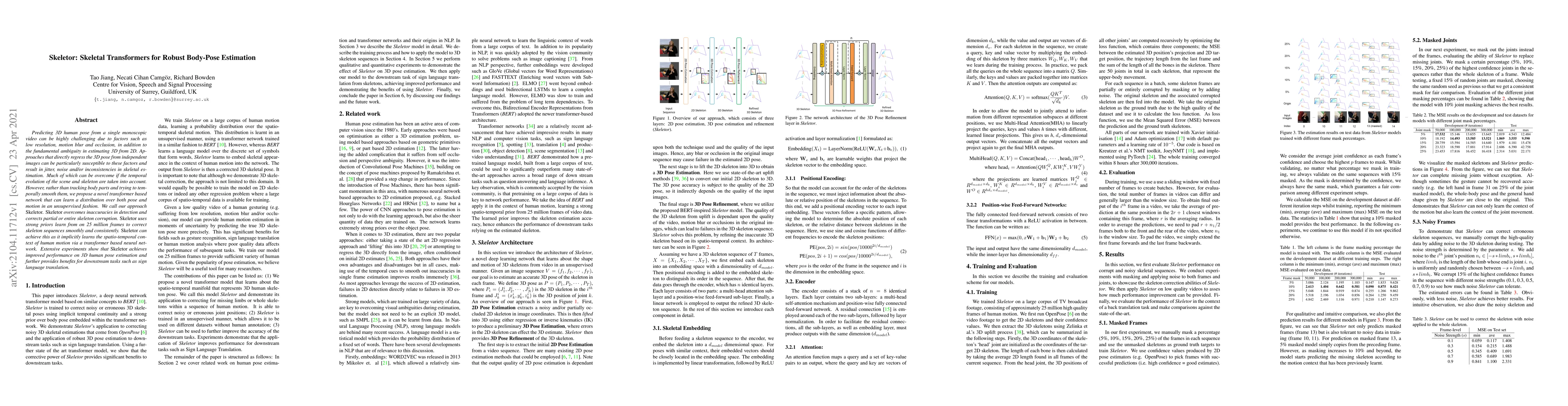 Predicting 3D human pose from a single monoscopic video can be highly challenging due to factors such as low resolution, motion blur and occlusion, in addition to the fundamental ambiguity in estimating 3D from 2D. Approaches that directly regress the 3D pose from independent images can be particularly susceptible to these factors and result in jitter, noise and/or inconsistencies in skeletal estimation. Much of which can be overcome if the temporal evolution of the scene and skeleton are taken into account. However, rather than tracking body parts and trying to temporally smooth them, we propose a novel transformer based network that can learn a distribution over both pose and motion in an unsupervised fashion. We call our approach Skeletor. Skeletor overcomes inaccuracies in detection and corrects partial or entire skeleton corruption. Skeletor uses strong priors learn from on 25 million frames to correct skeleton sequences smoothly and consistently. Skeletor can achieve this as it implicitly learns the spatio-temporal context of human motion via a transformer based neural network. Extensive experiments show that Skeletor achieves improved performance on 3D human pose estimation and further provides benefits for downstream tasks such as sign language translation.