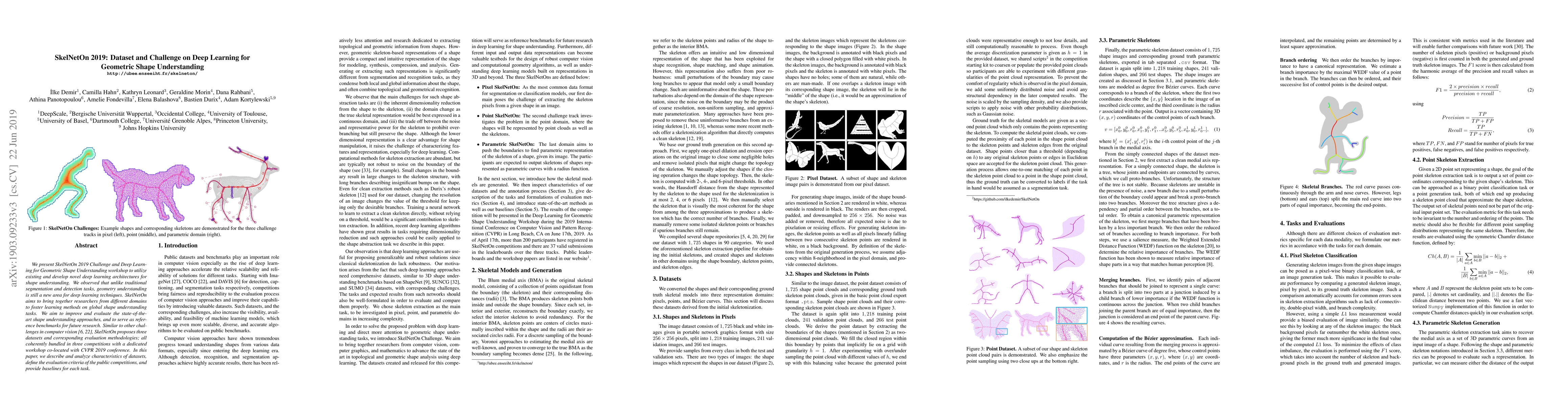 We present SkelNetOn 2019 Challenge and Deep Learning for Geometric Shape Understanding workshop to utilize existing and develop novel deep learning architectures for shape understanding. We observed that unlike traditional segmentation and detection tasks, geometry understanding is still a new area for deep learning techniques. SkelNetOn aims to bring together researchers from different domains to foster learning methods on global shape understanding tasks. We aim to improve and evaluate the state-of-the-art shape understanding approaches, and to serve as reference benchmarks for future research. Similar to other challenges in computer vision, SkelNetOn proposes three datasets and corresponding evaluation methodologies; all coherently bundled in three competitions with a dedicated workshop co-located with CVPR 2019 conference. In this paper, we describe and analyze characteristics of datasets, define the evaluation criteria of the public competitions, and provide baselines for each task.