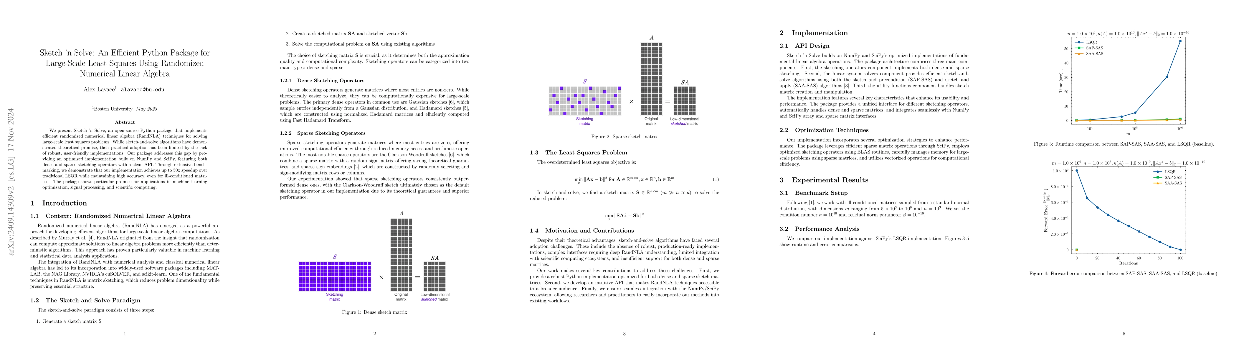 Sketch-and-solve is a powerful paradigm for tackling large-scale computational problems by reducing their dimensionality using sketching matrices. This paper focuses on applying sketch-and-solve algorithms to efficiently solve the overdetermined least squares problem, which is fundamental in various domains such as machine learning, signal processing, and numerical optimization. We provide a comprehensive overview of the sketch-and-solve paradigm and analyze different sketching operators, including dense and sparse variants. We introduce the Sketch-and-Apply (SAA-SAS) algorithm, which leverages randomized numerical linear algebra techniques to compute approximate solutions efficiently. Through extensive experiments on large-scale least squares problems, we demonstrate that our proposed approach significantly outperforms the traditional Least-Squares QR (LSQR) algorithm in terms of runtime while maintaining comparable accuracy. Our results highlight the potential of sketch-and-solve techniques in efficiently handling large-scale numerical linear algebra problems.