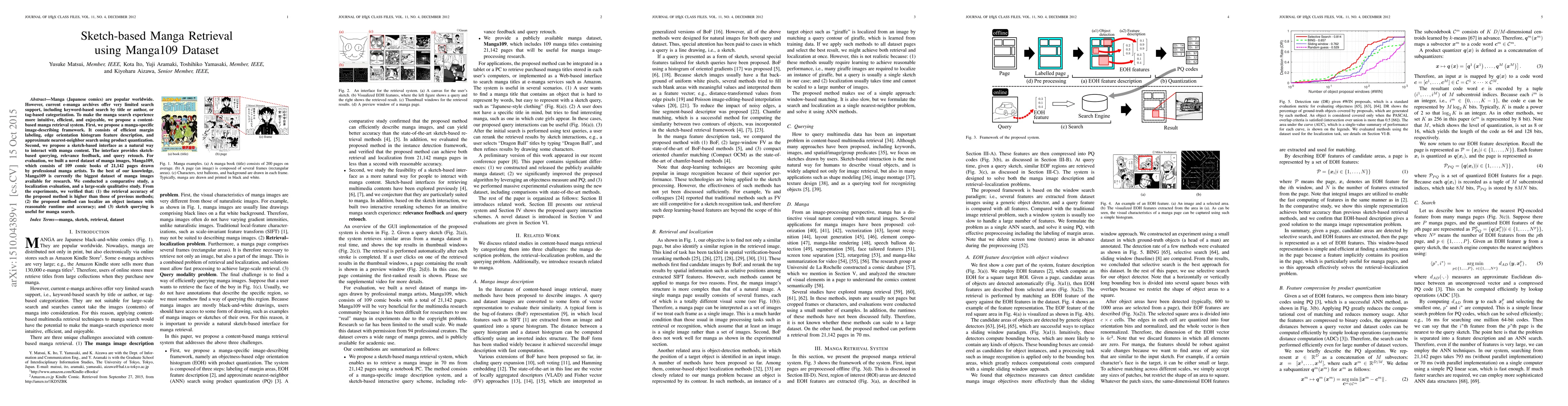 This paper proposes a sketch-based manga retrieval system using a new dataset, Manga109, which includes 109 comic books with 21,142 pages. The system employs a manga-specific image-describing framework and a sketch-based interface for intuitive querying, showing higher retrieval accuracy and effective object localization compared to previous methods.