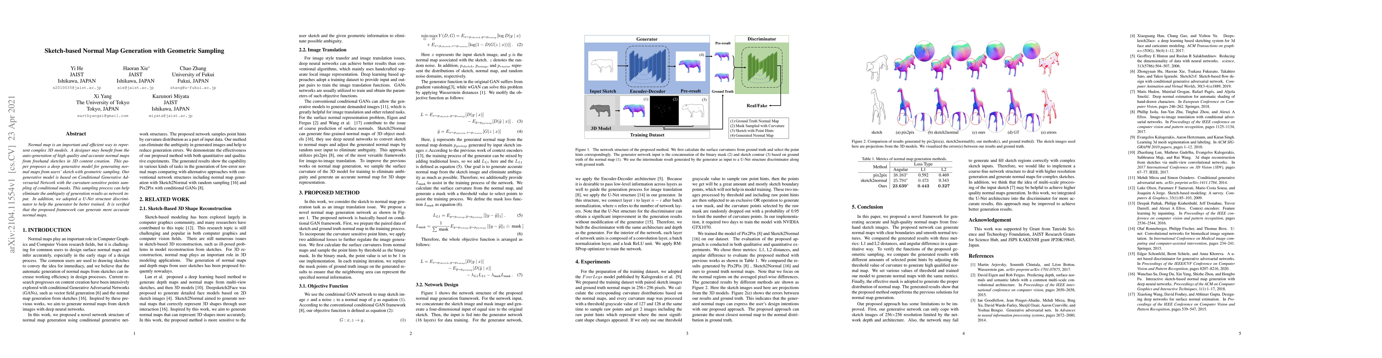 This paper proposes a deep generative model using Conditional Generative Adversarial Network (GAN) to auto-generate high-quality normal maps from freehand sketches, employing geometric sampling to enhance accuracy and reduce ambiguity. The U-Net structure discriminator aids in better training, resulting in more precise normal maps.