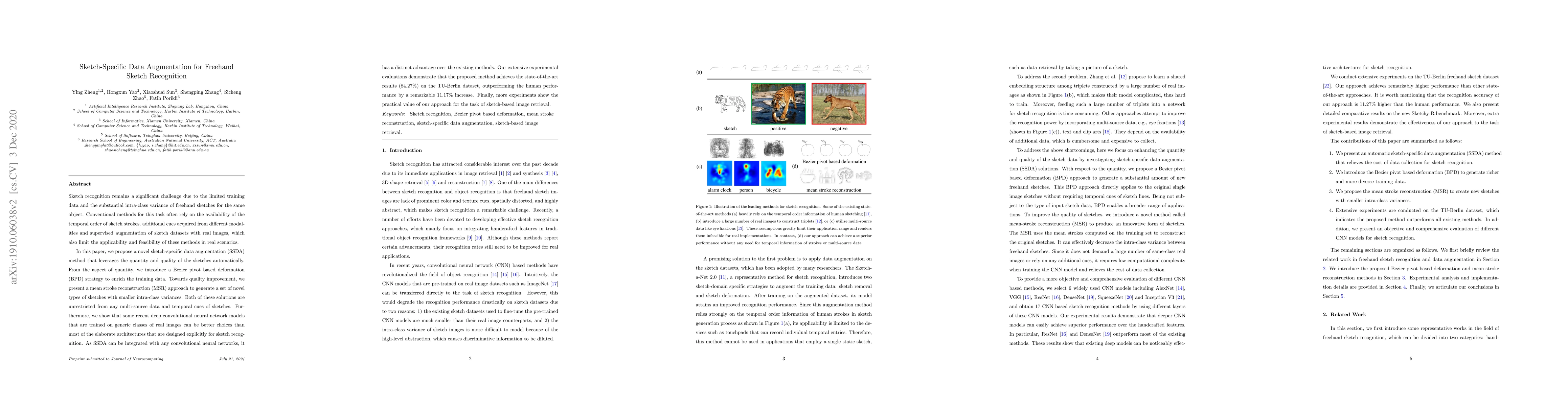 Sketch recognition remains a significant challenge due to the limited training data and the substantial intra-class variance of freehand sketches for the same object. Conventional methods for this task often rely on the availability of the temporal order of sketch strokes, additional cues acquired from different modalities and supervised augmentation of sketch datasets with real images, which also limit the applicability and feasibility of these methods in real scenarios. In this paper, we propose a novel sketch-specific data augmentation (SSDA) method that leverages the quantity and quality of the sketches automatically. From the aspect of quantity, we introduce a Bezier pivot based deformation (BPD) strategy to enrich the training data. Towards quality improvement, we present a mean stroke reconstruction (MSR) approach to generate a set of novel types of sketches with smaller intra-class variances. Both of these solutions are unrestricted from any multi-source data and temporal cues of sketches. Furthermore, we show that some recent deep convolutional neural network models that are trained on generic classes of real images can be better choices than most of the elaborate architectures that are designed explicitly for sketch recognition. As SSDA can be integrated with any convolutional neural networks, it has a distinct advantage over the existing methods. Our extensive experimental evaluations demonstrate that the proposed method achieves the state-of-the-art results (84.27%) on the TU-Berlin dataset, outperforming the human performance by a remarkable 11.17% increase. Finally, more experiments show the practical value of our approach for the task of sketch-based image retrieval.