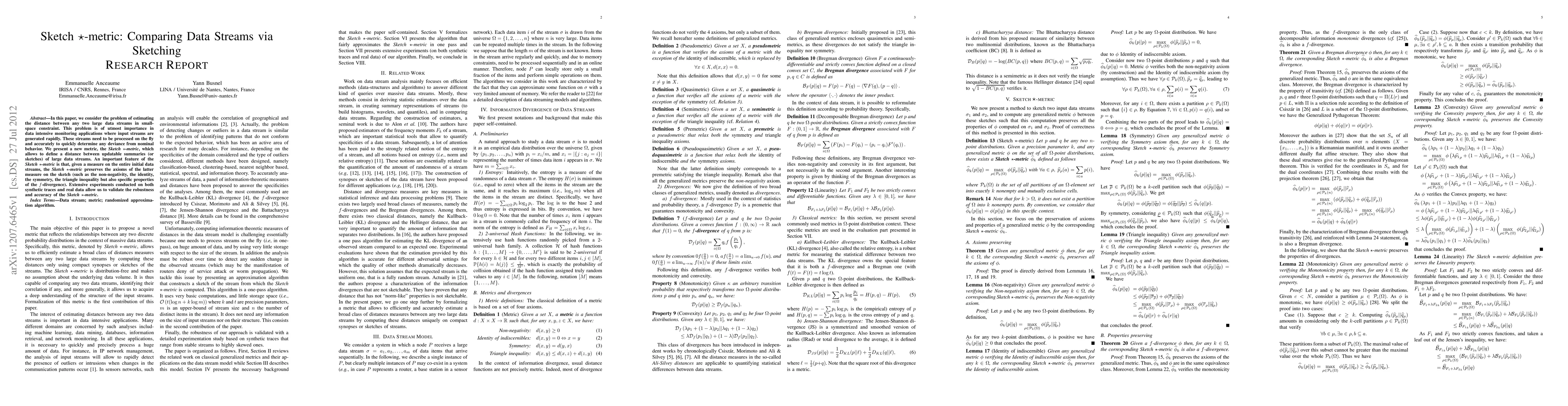 The paper introduces the Sketch \star-metric to estimate distances between large data streams under small-space constraints, preserving key properties of initial measures. Experiments on synthetic and real data demonstrate the metric's robustness and accuracy in real-time monitoring applications.