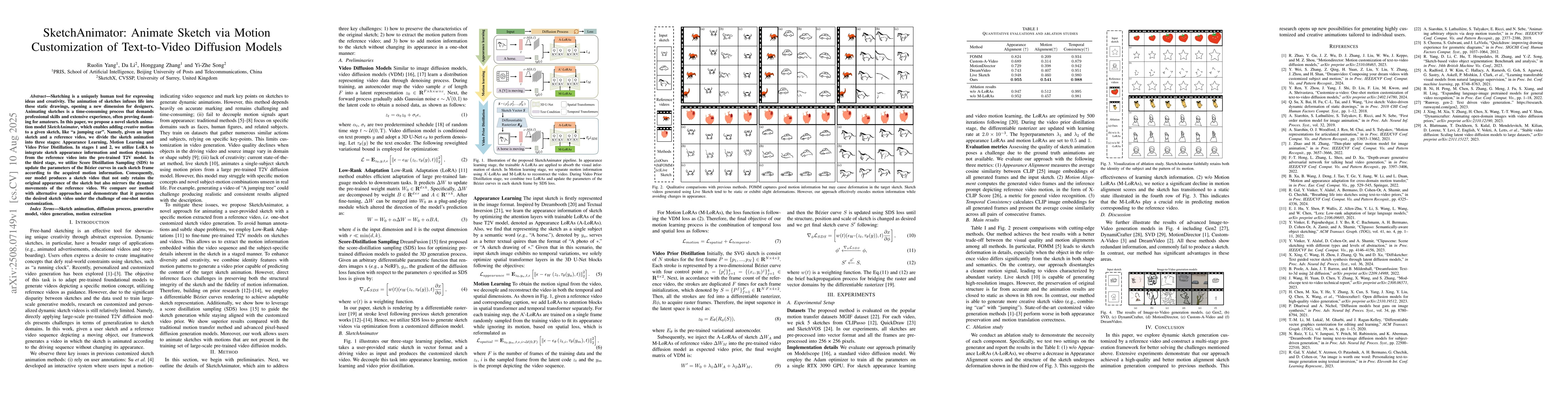 Sketching is a uniquely human tool for expressing ideas and creativity. The animation of sketches infuses life into these static drawings, opening a new dimension for designers. Animating sketches is a time-consuming process that demands professional skills and extensive experience, often proving daunting for amateurs. In this paper, we propose a novel sketch animation model SketchAnimator, which enables adding creative motion to a given sketch, like "a jumping car''. Namely, given an input sketch and a reference video, we divide the sketch animation into three stages: Appearance Learning, Motion Learning and Video Prior Distillation. In stages 1 and 2, we utilize LoRA to integrate sketch appearance information and motion dynamics from the reference video into the pre-trained T2V model. In the third stage, we utilize Score Distillation Sampling (SDS) to update the parameters of the Bezier curves in each sketch frame according to the acquired motion information. Consequently, our model produces a sketch video that not only retains the original appearance of the sketch but also mirrors the dynamic movements of the reference video. We compare our method with alternative approaches and demonstrate that it generates the desired sketch video under the challenge of one-shot motion customization.