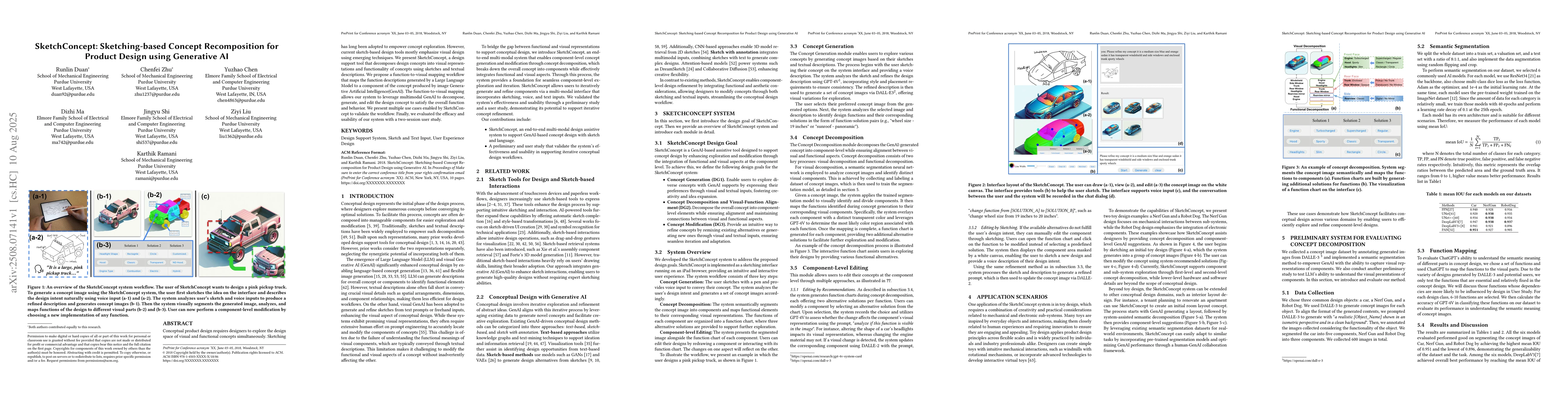 The research presents SketchConcept, a design support tool that decomposes design concepts into visual representations and functionality using sketches and textual descriptions. It proposes a function-to-visual mapping workflow that leverages multimodal GenAI for decomposing, generating, and editing design concepts.