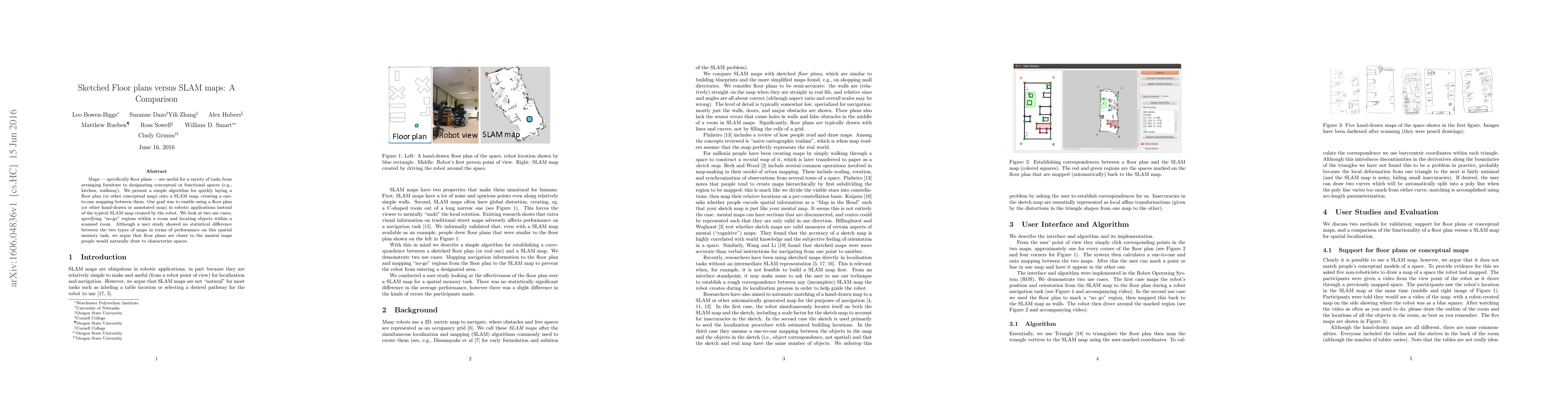 This paper proposes an algorithm to overlay sketched floor plans onto SLAM maps for robotic applications, comparing its effectiveness to traditional SLAM maps. Despite no significant performance difference in spatial memory tasks, the authors argue that floor plans are more intuitive for human spatial characterization.