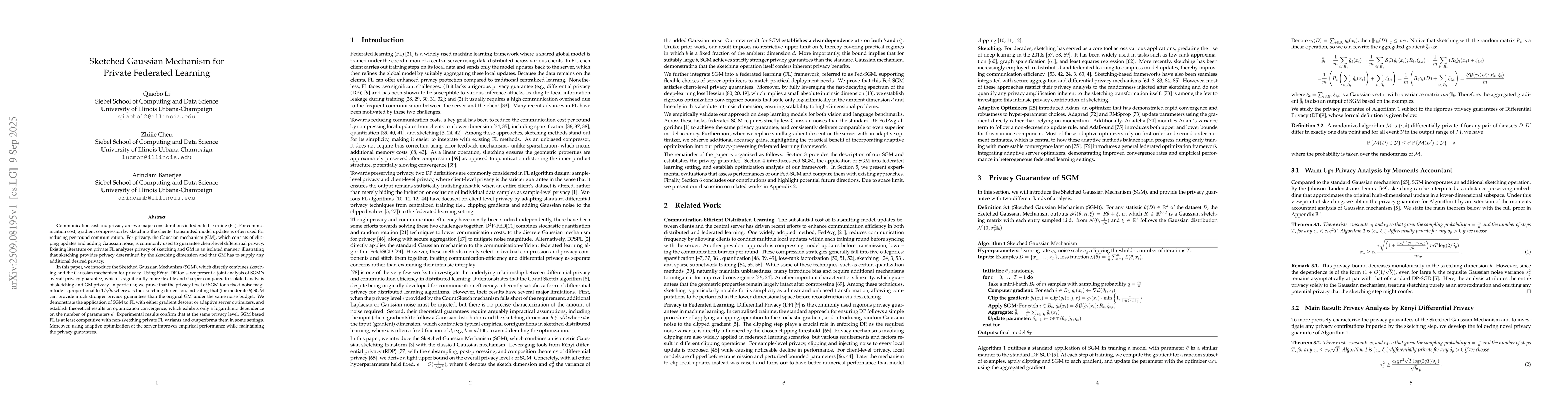 Communication cost and privacy are two major considerations in federated learning (FL). For communication cost, gradient compression by sketching the clients' transmitted model updates is often used for reducing per-round communication. For privacy, the Gaussian mechanism (GM), which consists of clipping updates and adding Gaussian noise, is commonly used to guarantee client-level differential privacy. Existing literature on private FL analyzes privacy of sketching and GM in an isolated manner, illustrating that sketching provides privacy determined by the sketching dimension and that GM has to supply any additional desired privacy. In this paper, we introduce the Sketched Gaussian Mechanism (SGM), which directly combines sketching and the Gaussian mechanism for privacy. Using R\'enyi-DP tools, we present a joint analysis of SGM's overall privacy guarantee, which is significantly more flexible and sharper compared to isolated analysis of sketching and GM privacy. In particular, we prove that the privacy level of SGM for a fixed noise magnitude is proportional to $1/\sqrt{b}$, where $b$ is the sketching dimension, indicating that (for moderate $b$) SGM can provide much stronger privacy guarantees than the original GM under the same noise budget. We demonstrate the application of SGM to FL with either gradient descent or adaptive server optimizers, and establish theoretical results on optimization convergence, which exhibits only a logarithmic dependence on the number of parameters $d$. Experimental results confirm that at the same privacy level, SGM based FL is at least competitive with non-sketching private FL variants and outperforms them in some settings. Moreover, using adaptive optimization at the server improves empirical performance while maintaining the privacy guarantees.