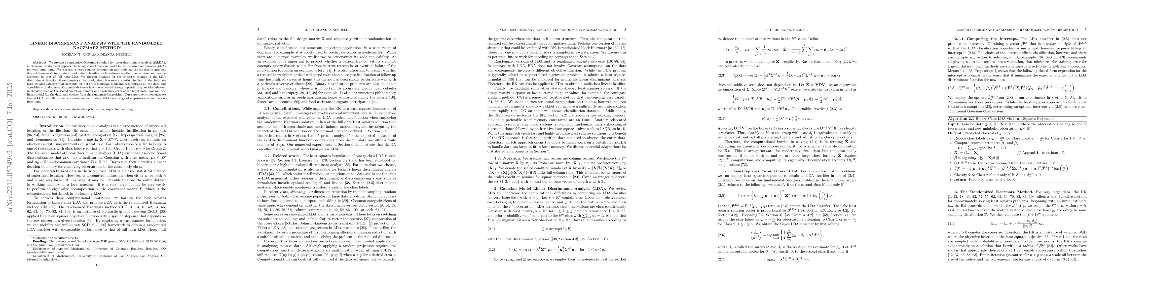 This paper proposes a sketched linear discriminant analysis method using the randomized Kaczmarz method for binary-class Gaussian model LDA on large datasets. It achieves comparable performance to full data LDA while processing only one training data row at a time, with convergence guarantees and demonstrated effectiveness through numerical experiments.