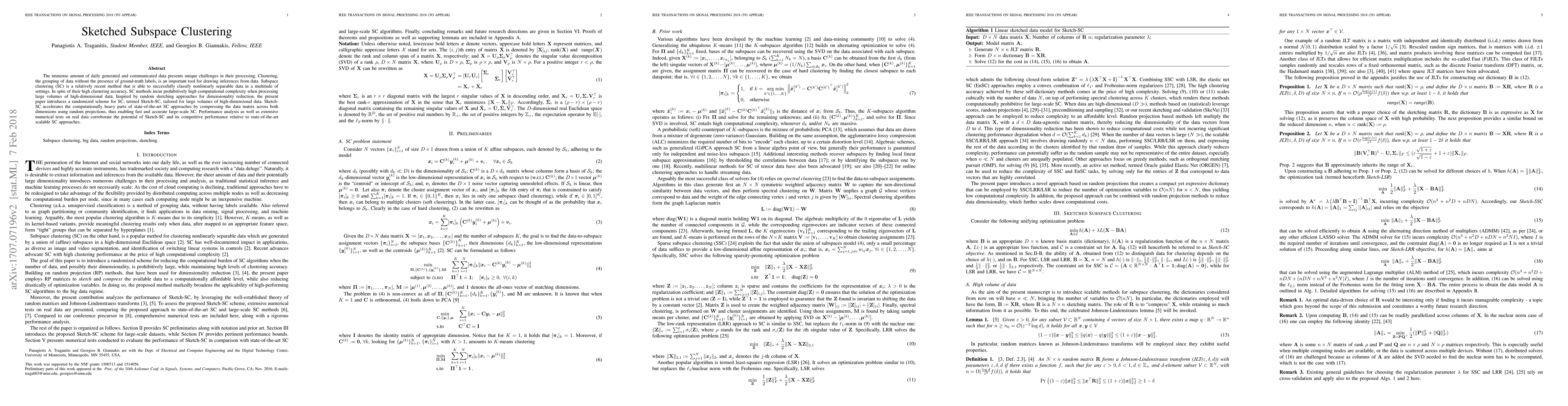 The paper introduces Sketch-SC, a randomized subspace clustering method that employs random projections to reduce computational complexity for large, high-dimensional data, achieving fast and accurate clustering while maintaining competitive performance against other scalable approaches. Performance analysis and tests on real data validate the effectiveness of Sketch-SC.