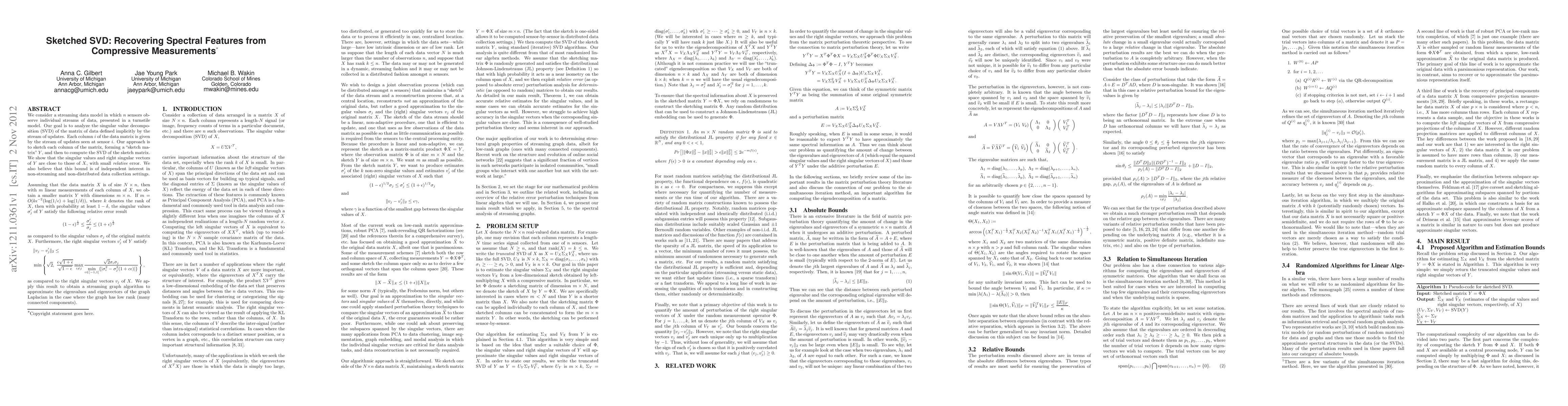 We consider a streaming data model in which n sensors observe individual streams of data, presented in a turnstile model. Our goal is to analyze the singular value decomposition (SVD) of the matrix of data defined implicitly by the stream of updates. Each column i of the data matrix is given by the stream of updates seen at sensor i. Our approach is to sketch each column of the matrix, forming a "sketch matrix" Y, and then to compute the SVD of the sketch matrix. We show that the singular values and right singular vectors of Y are close to those of X, with small relative error. We also believe that this bound is of independent interest in non-streaming and non-distributed data collection settings. Assuming that the data matrix X is of size Nxn, then with m linear measurements of each column of X, we obtain a smaller matrix Y with dimensions mxn. If m = O(k \epsilon^{-2} (log(1/\epsilon) + log(1/\delta)), where k denotes the rank of X, then with probability at least 1-\delta, the singular values \sigma'_j of Y satisfy the following relative error result (1-\epsilon)^(1/2)<= \sigma'_j/\sigma_j <= (1 + \epsilon)^(1/2) as compared to the singular values \sigma_j of the original matrix X. Furthermore, the right singular vectors v'_j of Y satisfy ||v_j-v_j'||_2 <= min(sqrt{2}, (\epsilon\sqrt{1+\epsilon})/(\sqrt{1-\epsilon}) max_{i\neq j} (\sqrt{2}\sigma_i\sigma_j)/(min_{c\in[-1,1]}(|\sigma^2_i-\sigma^2_j(1+c\epsilon)|))) as compared to the right singular vectors v_j of X. We apply this result to obtain a streaming graph algorithm to approximate the eigenvalues and eigenvectors of the graph Laplacian in the case where the graph has low rank (many connected components).