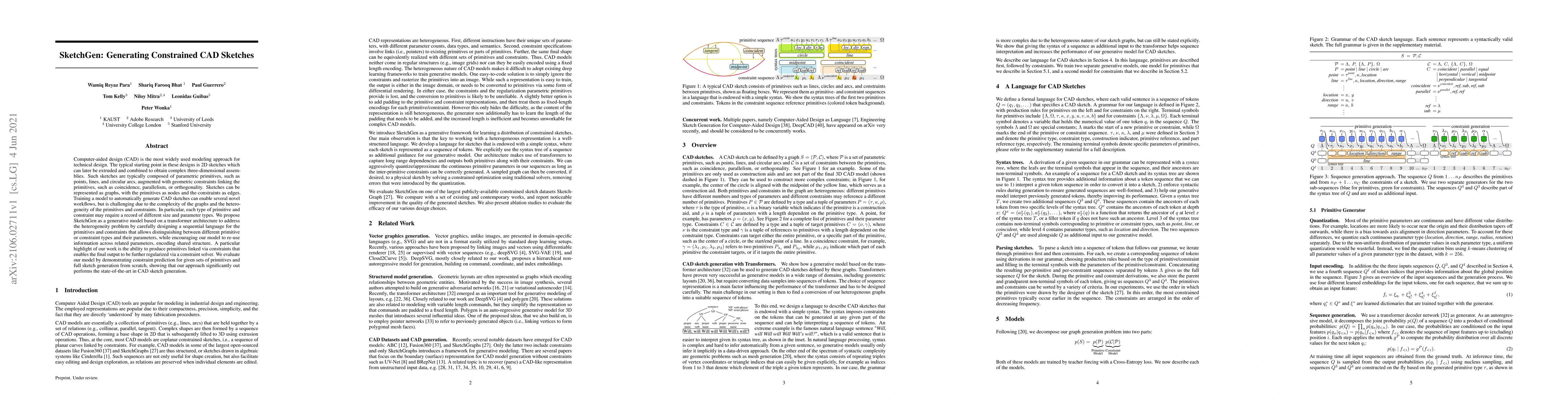 Computer-aided design (CAD) is the most widely used modeling approach for technical design. The typical starting point in these designs is 2D sketches which can later be extruded and combined to obtain complex three-dimensional assemblies. Such sketches are typically composed of parametric primitives, such as points, lines, and circular arcs, augmented with geometric constraints linking the primitives, such as coincidence, parallelism, or orthogonality. Sketches can be represented as graphs, with the primitives as nodes and the constraints as edges. Training a model to automatically generate CAD sketches can enable several novel workflows, but is challenging due to the complexity of the graphs and the heterogeneity of the primitives and constraints. In particular, each type of primitive and constraint may require a record of different size and parameter types. We propose SketchGen as a generative model based on a transformer architecture to address the heterogeneity problem by carefully designing a sequential language for the primitives and constraints that allows distinguishing between different primitive or constraint types and their parameters, while encouraging our model to re-use information across related parameters, encoding shared structure. A particular highlight of our work is the ability to produce primitives linked via constraints that enables the final output to be further regularized via a constraint solver. We evaluate our model by demonstrating constraint prediction for given sets of primitives and full sketch generation from scratch, showing that our approach significantly out performs the state-of-the-art in CAD sketch generation.