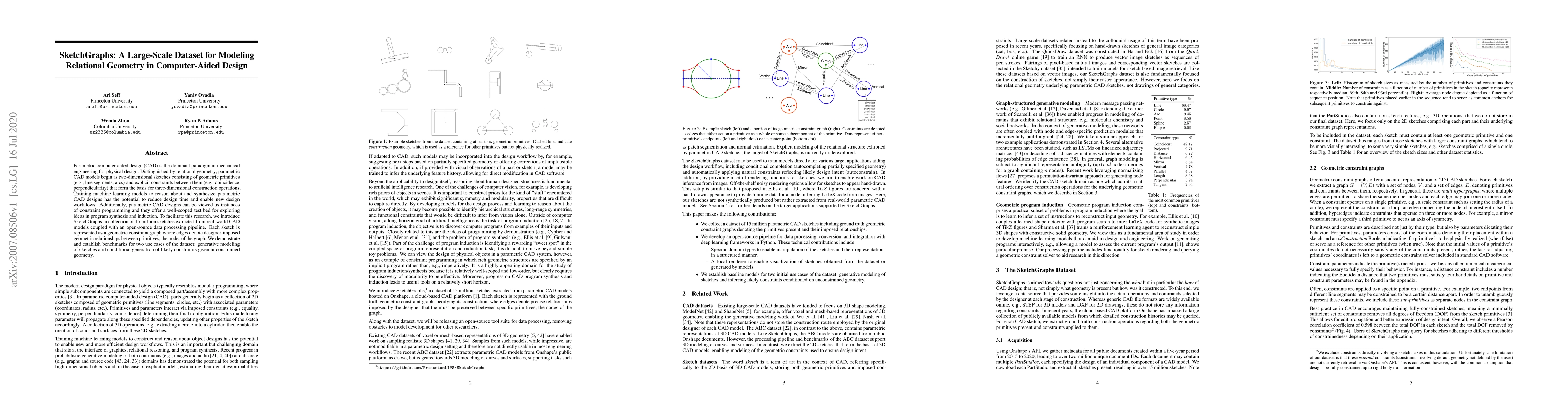 SketchGraphs is a large-scale dataset of 15 million CAD sketches, designed to model relational geometry and facilitate machine learning in parametric CAD. The dataset includes geometric constraint graphs and an open-source pipeline, enabling research in generative modeling and constraint-based synthesis.