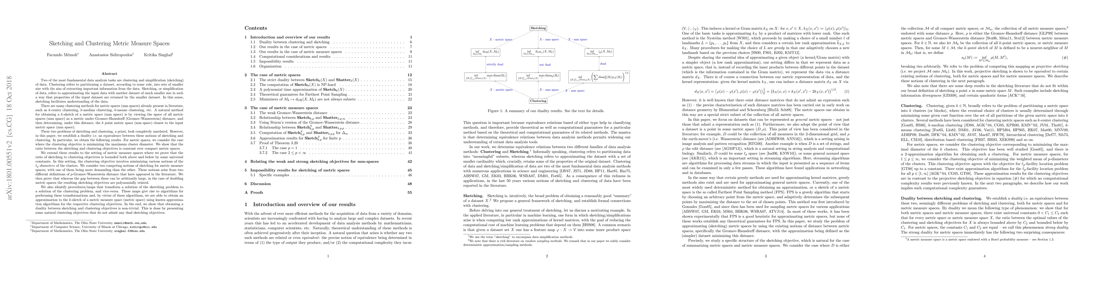 Two important optimization problems in the analysis of geometric data sets are clustering and sketching. Here, clustering refers to the problem of partitioning some input metric measure space (mm-space) into k clusters, minimizing some objective function f. Sketching, on the other hand, is the problem of approximating some mm-space by a smaller one supported on a set of k points. Specifically, we define the k-sketch of some mm-space M to be the nearest neighbor of M in the set of k-point mm-spaces, under some distance function \rho on the set of mm-spaces. In this paper, we demonstrate a duality between general classes of clustering and sketching problems. We present a general method for efficiently transforming a solution for a clustering problem to a solution for a sketching problem, and vice versa, with approximately equal cost. More specifically, we obtain the following results. 1. For metric spaces, we consider the case where the clustering objective is minimizing the maximum cluster diameter. We show that the ratio between the sketching and clustering objectives is constant over compact metric spaces. 2. We extend these results to the setting of metric measure spaces where we prove that the ratio of sketching to clustering objectives is bounded both above and below by some universal constants. In this setting, the clustering objective involves minimizing various notions of the l_p-diameters} of the clusters. 3. We consider two competing notions of sketching for mm-spaces, with one of them being more demanding than the other. These notions arise from two different definitions of p-Gromov-Wasserstein distance that have appeared in the literature. We then prove that whereas the gap between these can be arbitrarily large, in the case of doubling metric spaces the resulting sketching objectives are polynomially related.