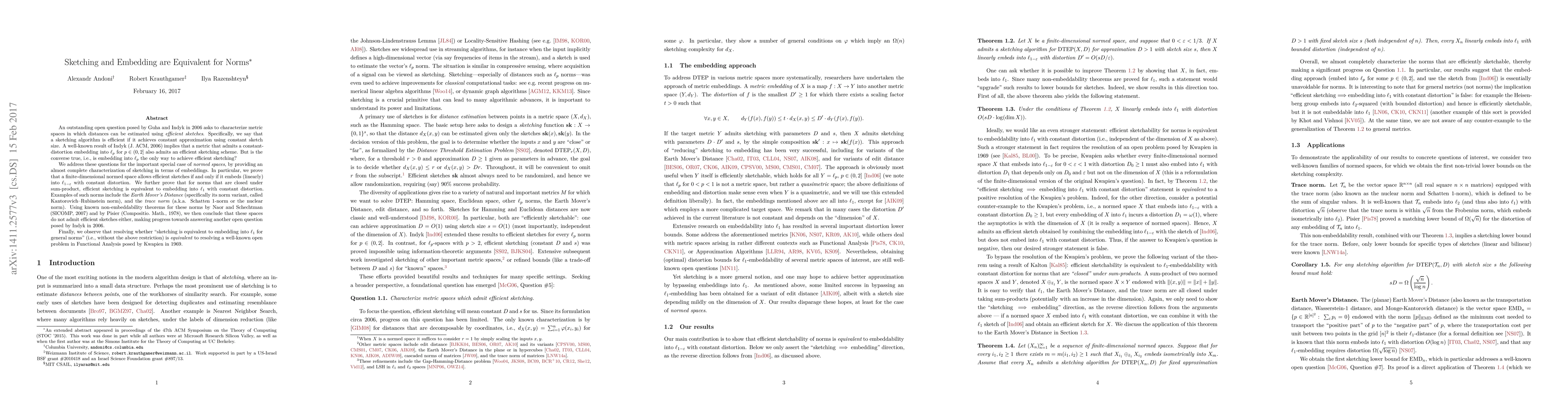 This paper characterizes efficient sketching for normed spaces, proving that a finite-dimensional normed space allows efficient sketches if and only if it embeds into $\ell_{1-\varepsilon}$ with constant distortion. For norms closed under sum-product, efficient sketching is equivalent to embedding into $\ell_1$.